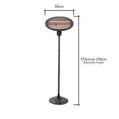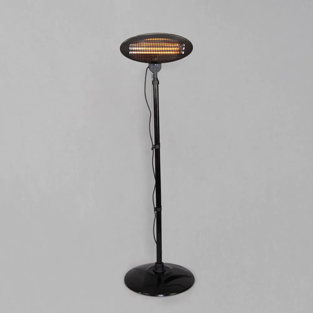 Bring a stylish but practical element to your outdoor seating arrangement with the 2000 Watt Floor Standing Carbon Element Patio Heater. This floor standing heater features a 12m2 heat distribution range and is IP44 rated to ensure water resistance. It also comes in a black finish with an oval design for a modern appearance and has a useful pull cord switch for convenience.