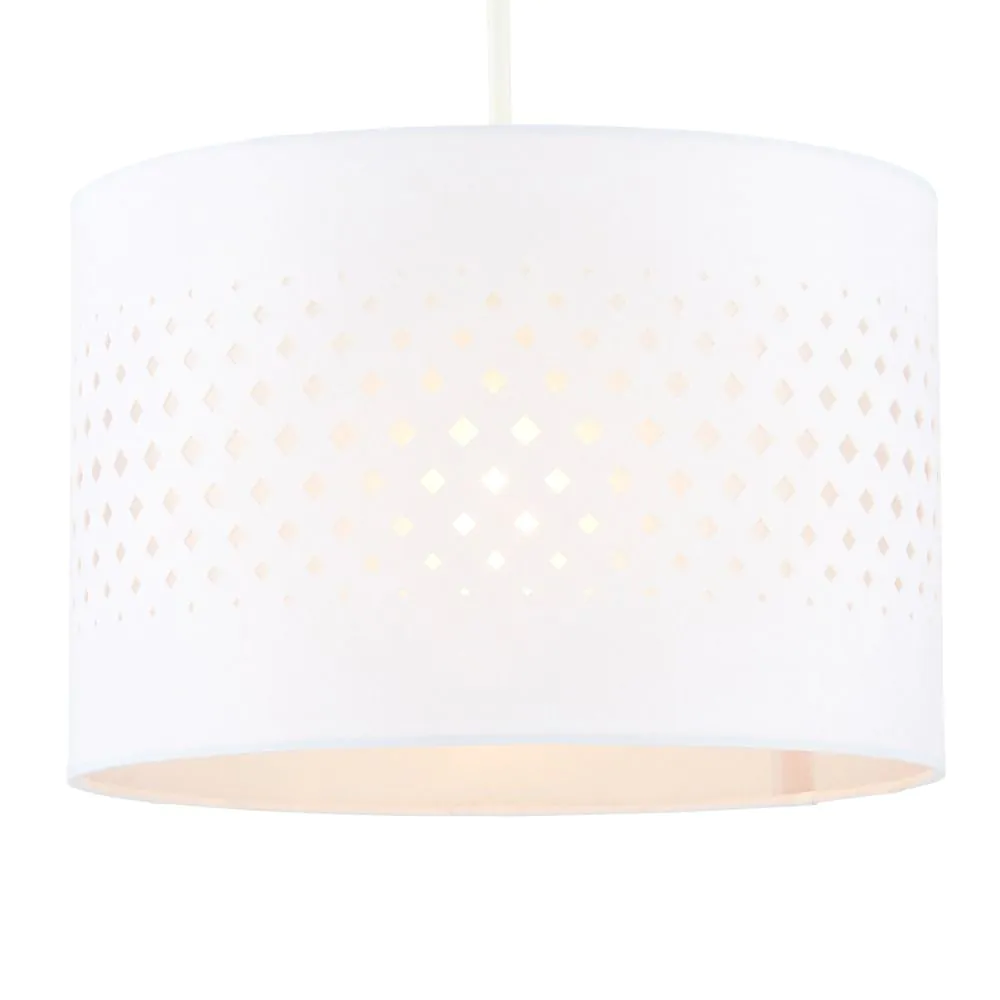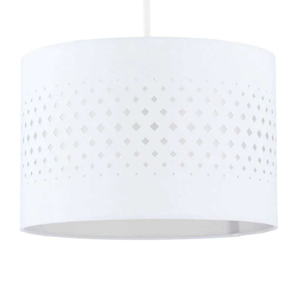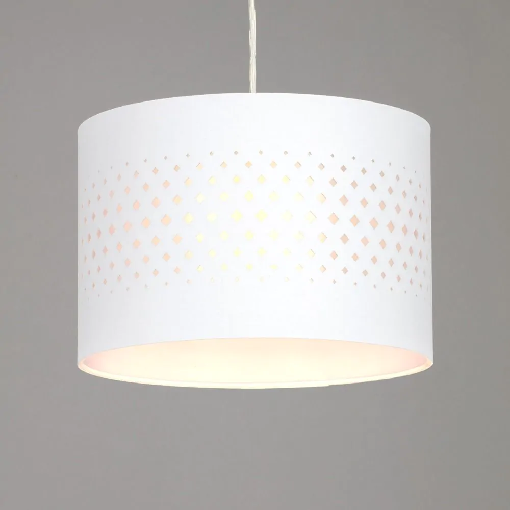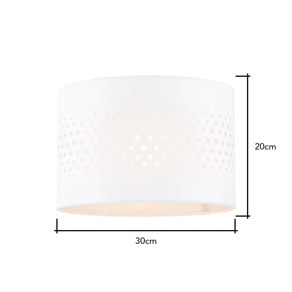 Our new 30cm Laser Cut Shade brings a modern vibe to your home, with a clean, white finish that opens up your room and provides a fresh style, fitting any space perfectly. The cylindrical shade features a beautiful assortment of laser cut diamond details, each allowing the light to shine through into a stunning display in your room.