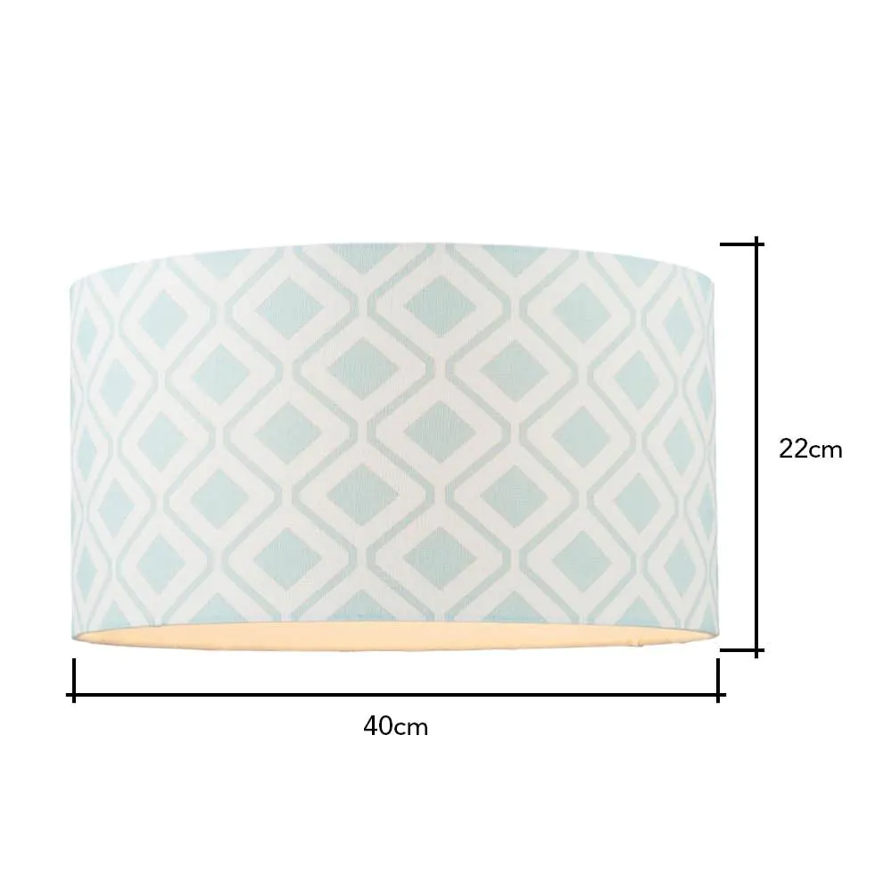 The 40cm Diamond Shade in Minty Blue is the perfect accent lighting addition to your interior lighting arrangements, with a minty blue colour creating a light pop of colour, as well as a modern diamond-style pattern creating a decorative look in your room. The cylindrical shade encompasses the light within and diffuses a warm, ambient glow throughout your room, perfect for creating a soothing, more relaxed atmosphere in your interior.
