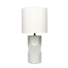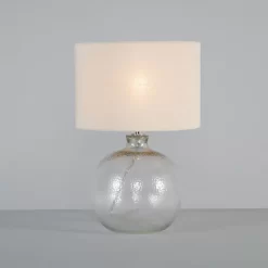 Inspire a stylish look in your home with the Alfie Bobble Glass Table Lamp. This table lamp features a clear vase shaped base with a mottled glass design for a unique texture and a refined appearance to your decor. It also comes with a natural shade for a warm glow diffused outwards, looking ideal on any bedside table or side board.