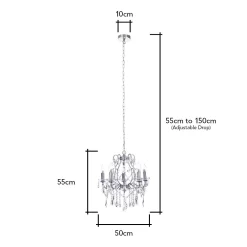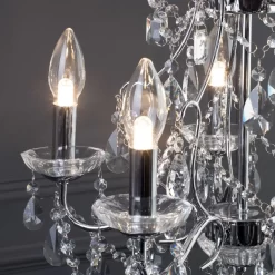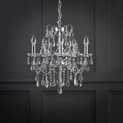 Statement lighting looks for your interior with the Annalee 5 Light Large Chandelier. With an IP rating of 44, this ceiling light is sufficiently water resistant enough to be used in the bathroom, with an adjustable chain to customise the height to your preference. This chandelier also comes gorgeously decorated with crystal effect droplets which hang from the elegant chrome curved frame and reflect the light as it shines out for a sparkling look.