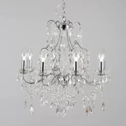 Stunning statement chandeliers for your interior with the Annalee 8 Light Chandelier. This gorgeous ceiling light fitting comes decorated in an array of crystal effect droplets and features a curving chrome frame for a sophisticated aesthetic. With an IP44 rating, this ceiling light is also water resistant enough to be installed in the bathroom as a beautiful centrepiece.