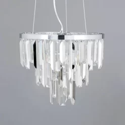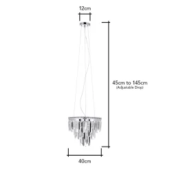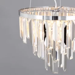The Beekham Ceiling Pendant Light in chrome is the perfect statement light fitting for your home. The elegant chrome finish perfectly complements the tiered crystal effect droplets as the light sparkles from the fitting. Separating the glitzy detailing is an arrangement of chrome metal shards – incorporating a contemporary tone into your home interior. Create an eye-catching centrepiece in any room with this beautiful pendant light, such as above your dining table or in your living room.