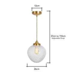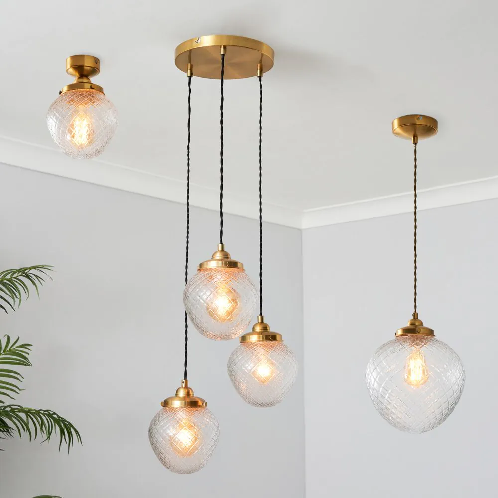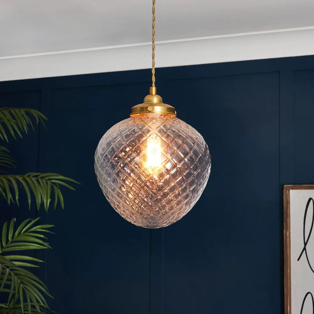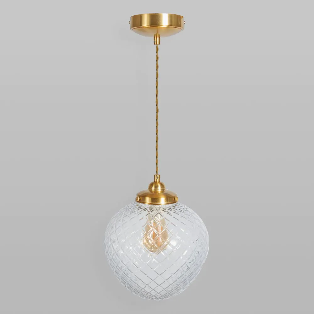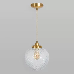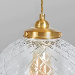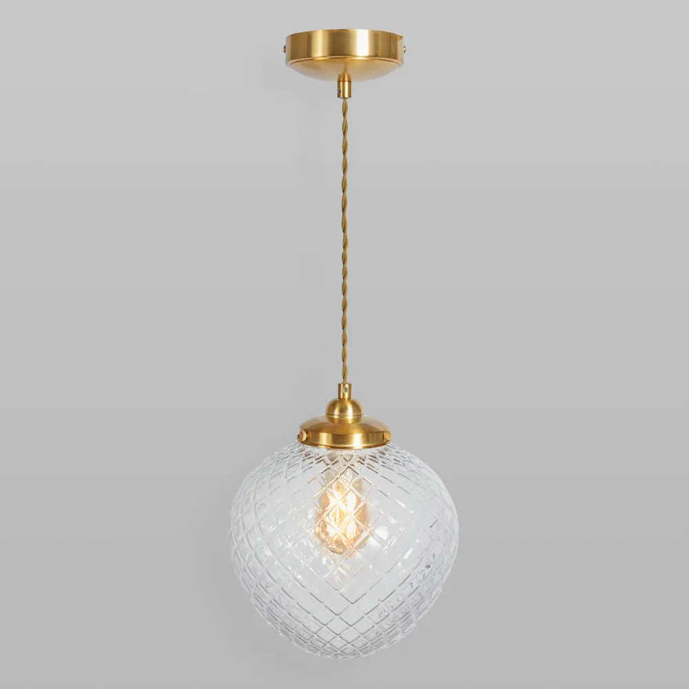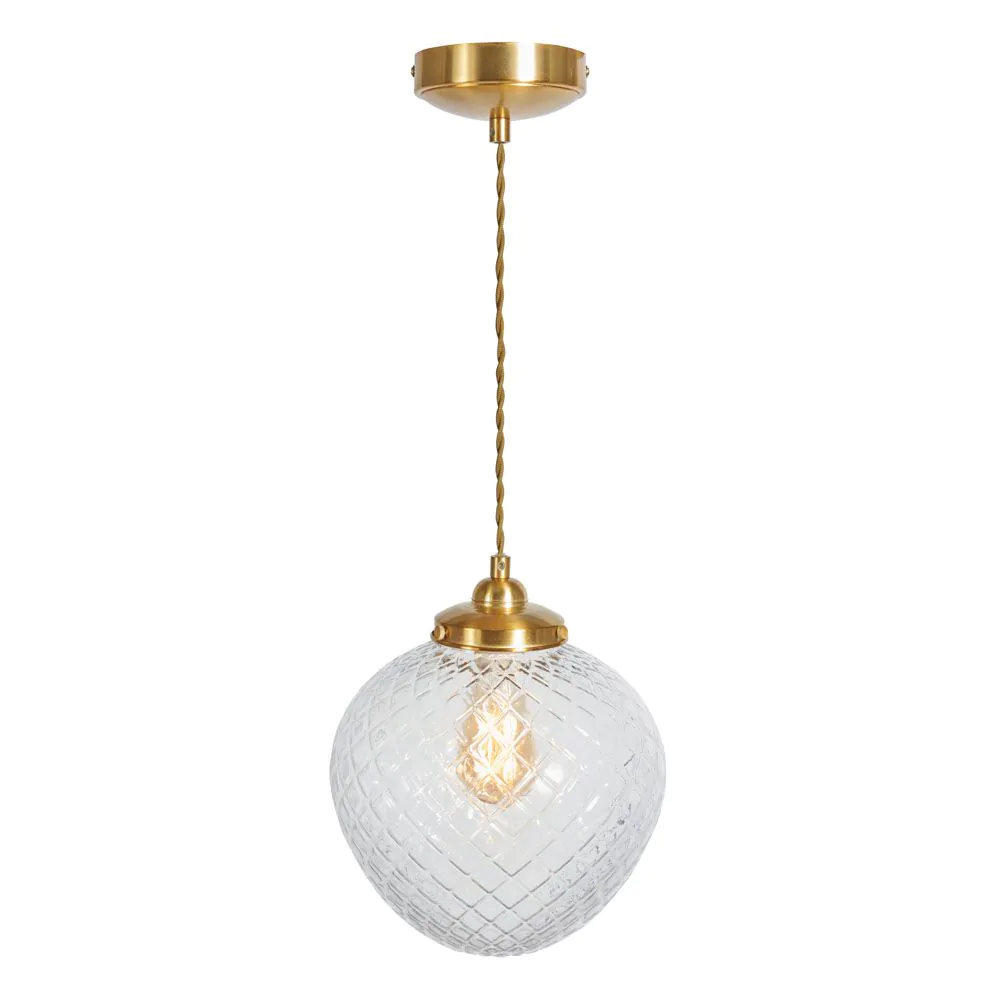 Elevate your space with the Betty 1 Light Brass Pendant in Brass and Clear. The combination of brass and clear lattice design glass exudes timeless elegance, while the height-adjustable pendant design adds a touch of sophistication. This pendant becomes a statement piece that enhances both your ambience and décor, ideal for styling over kitchen islands or bedside tables.