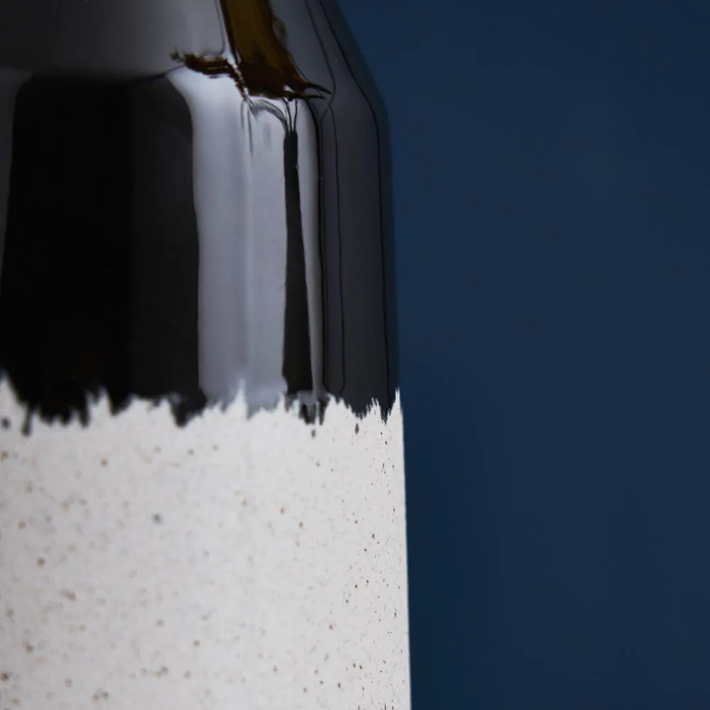Elevate your interior with our Textured Ceramic Vase in Black, a sophisticated piece that combines modern design with tactile allure. The textured surface creates a unique visual and tactile experience, while the sleek black finish adds a touch of refinement to any space and a gorgeous contrast to the taupe base. Its versatile size makes it perfect as an eye-catching standalone decor item or for displaying various floral arrangements.
