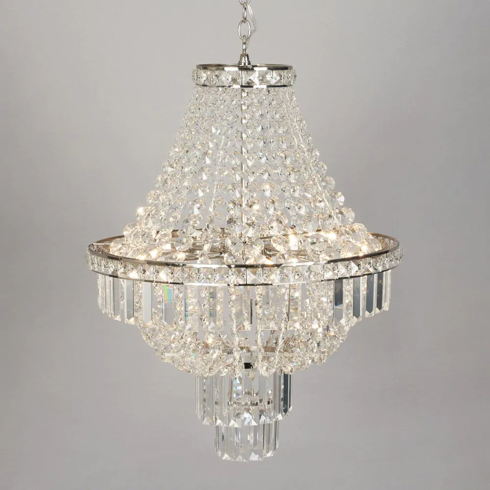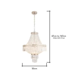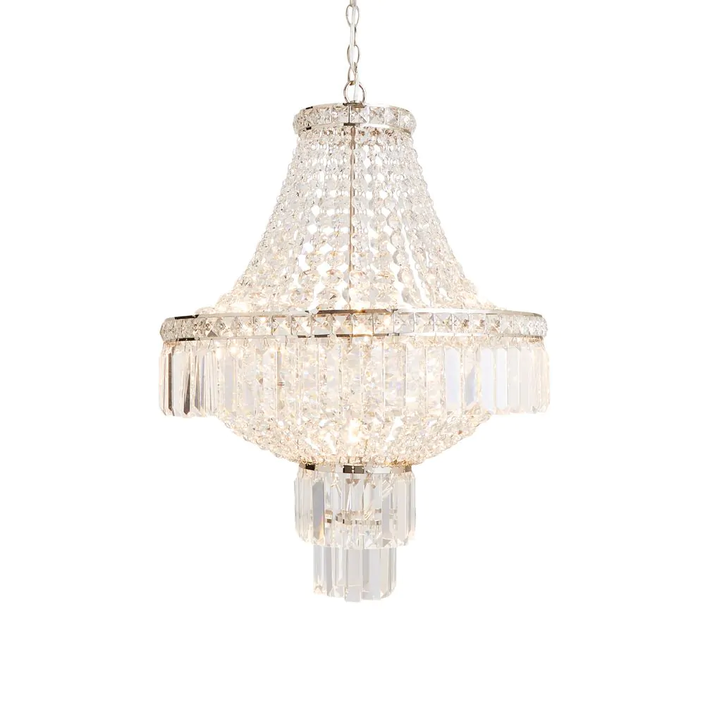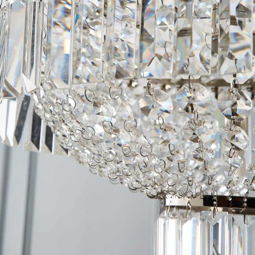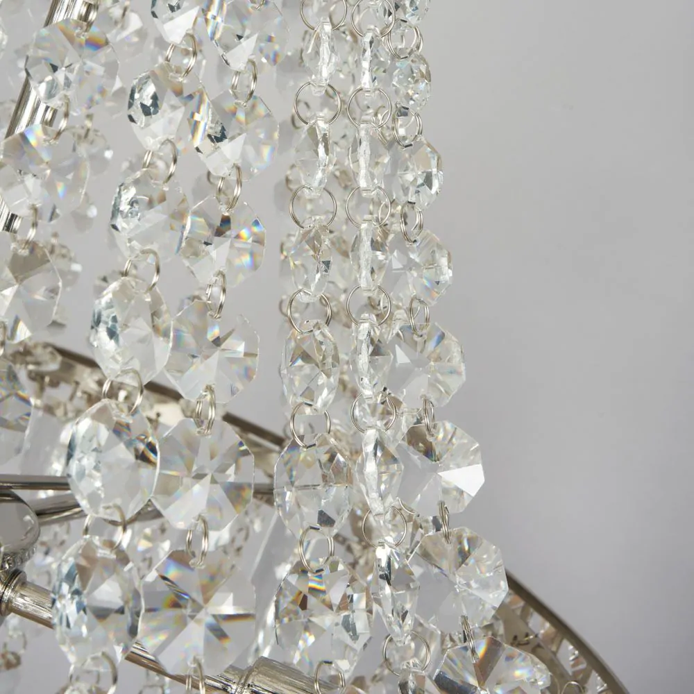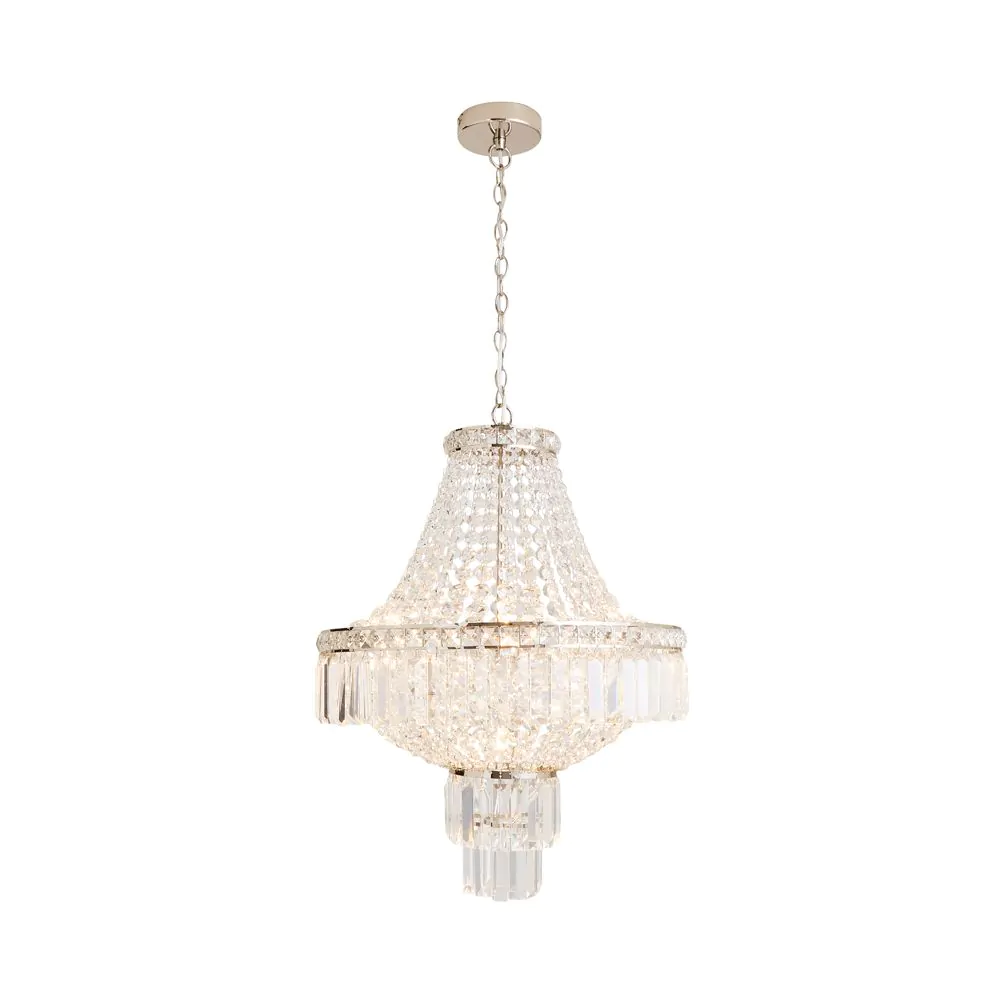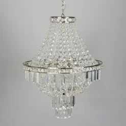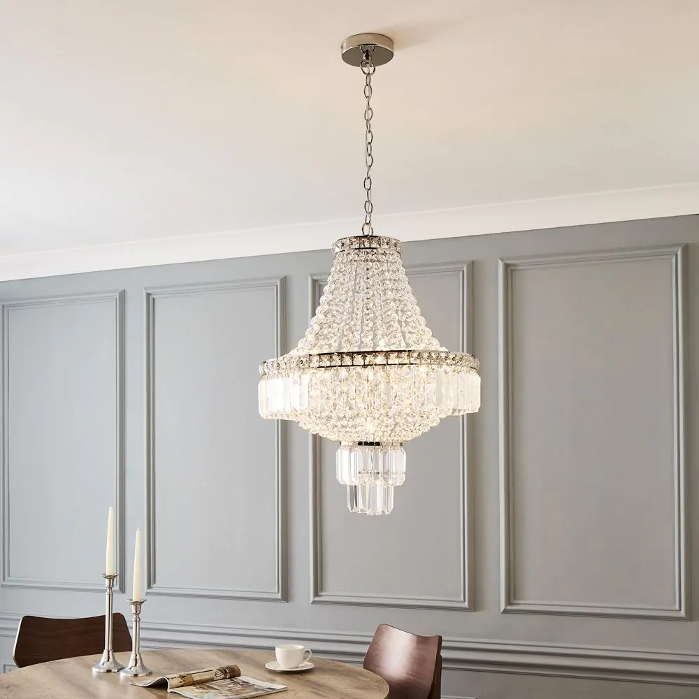Get a retro luxury for your home décor with the Chloey Chandelier. This ceiling light comes in a polished nickel finish and is adorned with crystal effect droplets and beading, mimicking the classical elegance that you would find with 1920s hotel lighting. It also looks ideal when styled in any entranceway, or over a dining table or kitchen island for a statement appearance that is guaranteed to be the centre of attention.