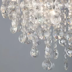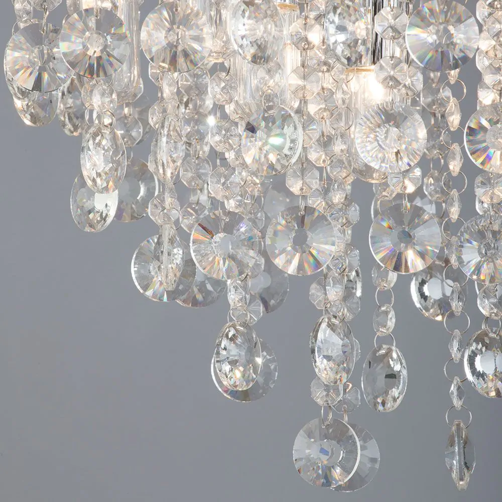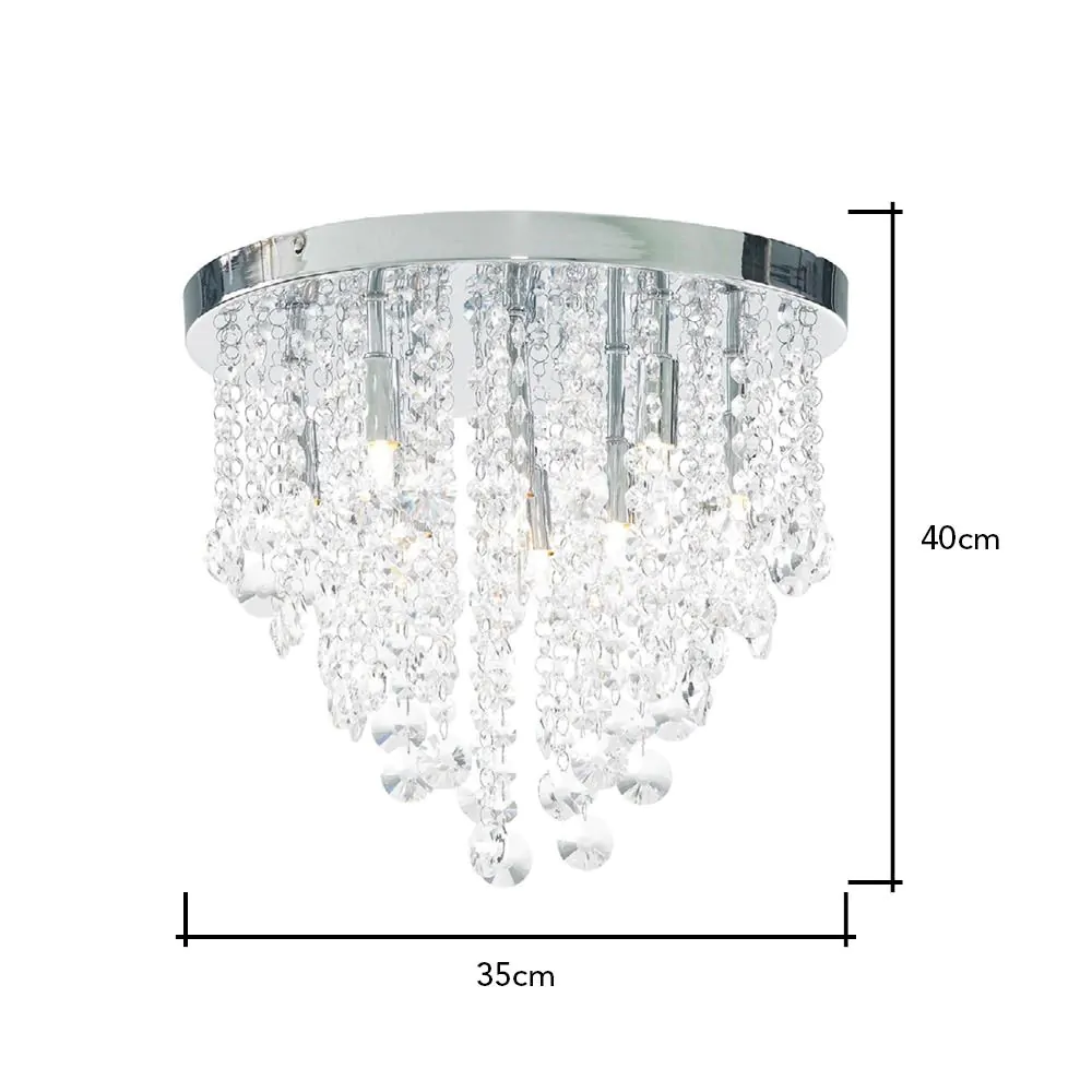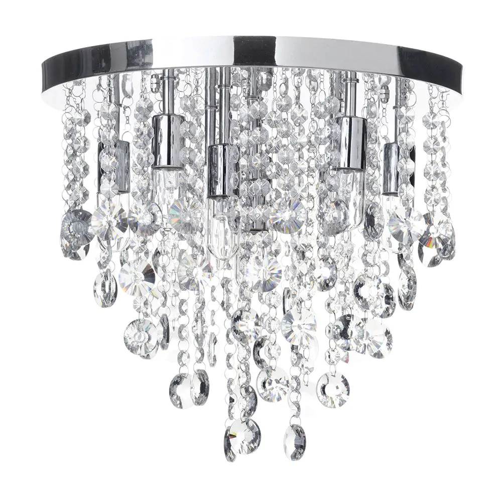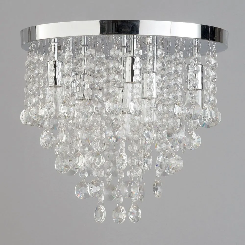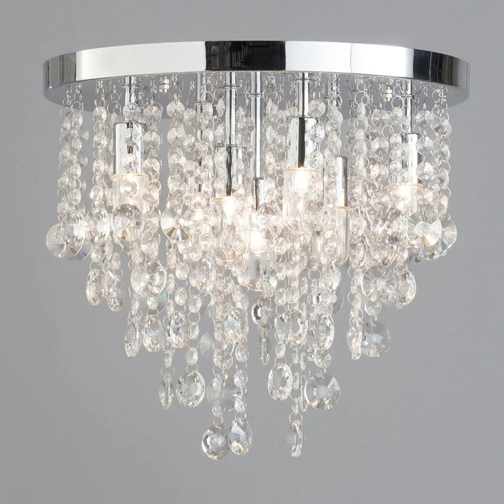 For rooms with lower ceilings, larger fittings such as pendant and chandeliers might not be a practical choice – their hefty drop can take up too much room in a tight space. This elegant piece features an arrangement of hanging crystal surrounding a group of central lights, meaning the crystals give a unique shimmer and sparkle as the light shines out across the interior. With a simple round chrome ceiling plate, this fitting is ideal for the bedroom or living room.