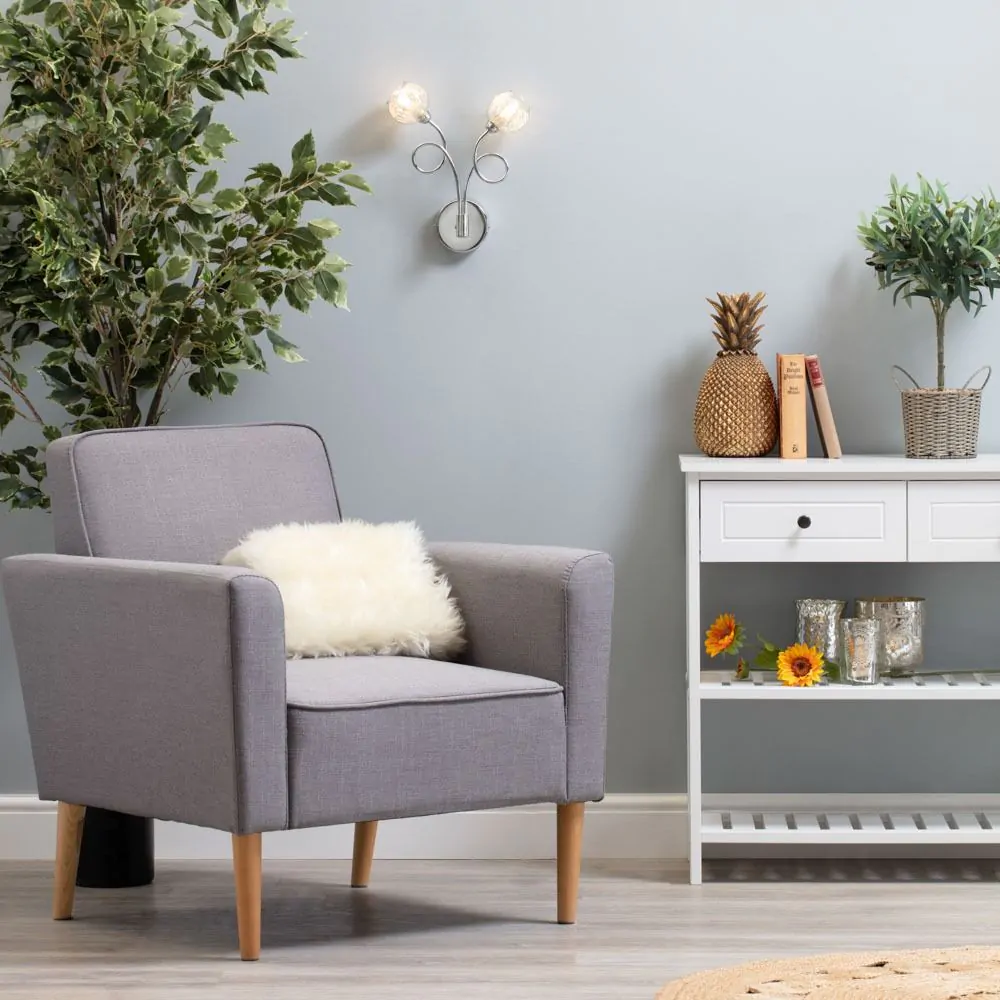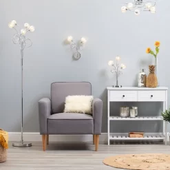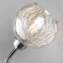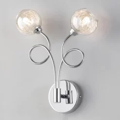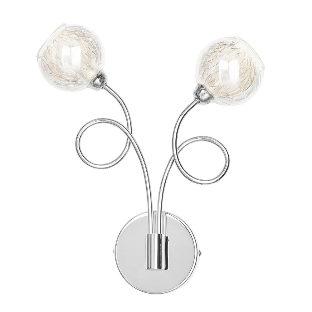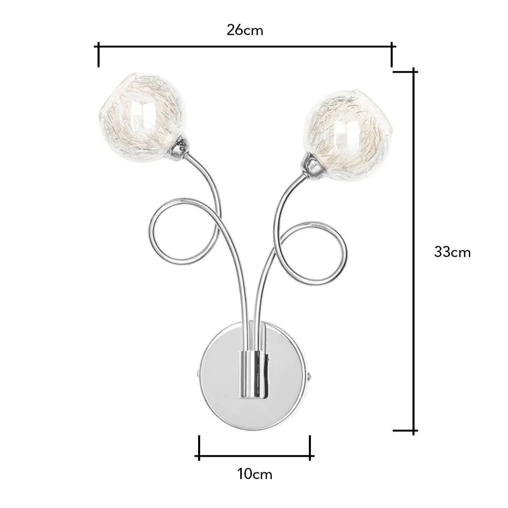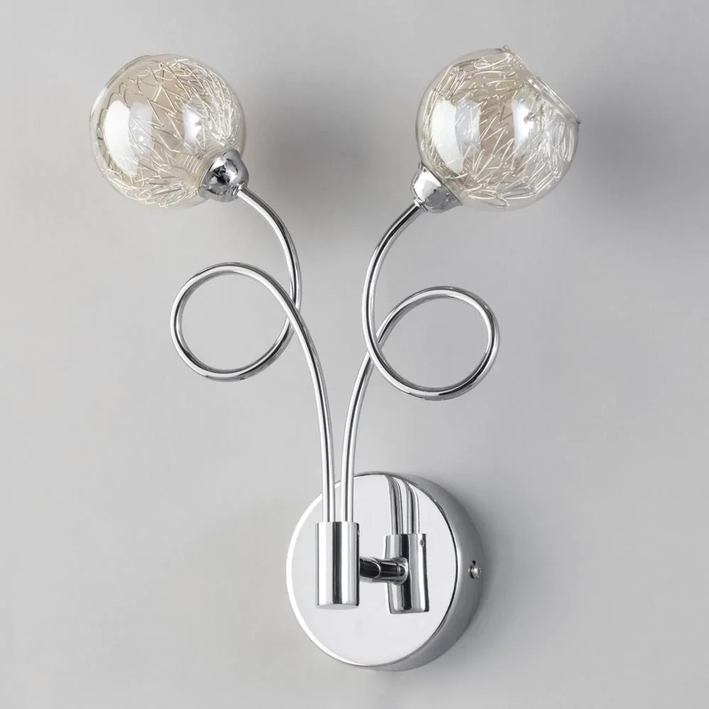 The new Cooper Wall Light in chrome finish, along with champagne detailing, is a beautifully romantic fixture for your home. The stunning twisting arms give a flowery effect, with 2 beautiful ball-shaped shades at the end, which include a modern, elegant wire nest detail in a sophisticated champagne hue. The glass detailing reflects a warm glow that gives any room an idyllic hue. This light would make a fantastic addition to your home, especially in the living room, bedroom or dining room, where the cosy mood really matters.