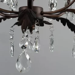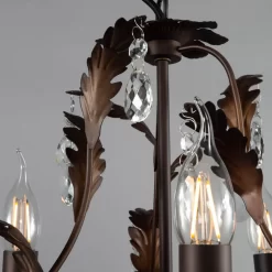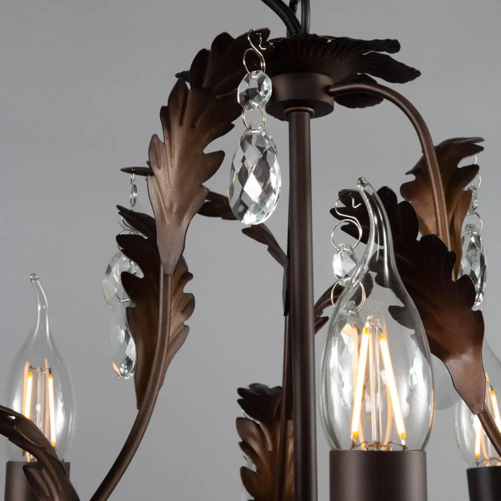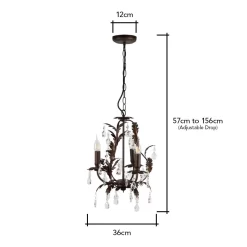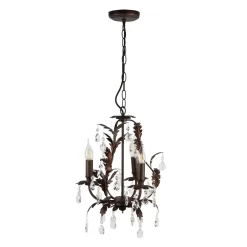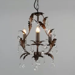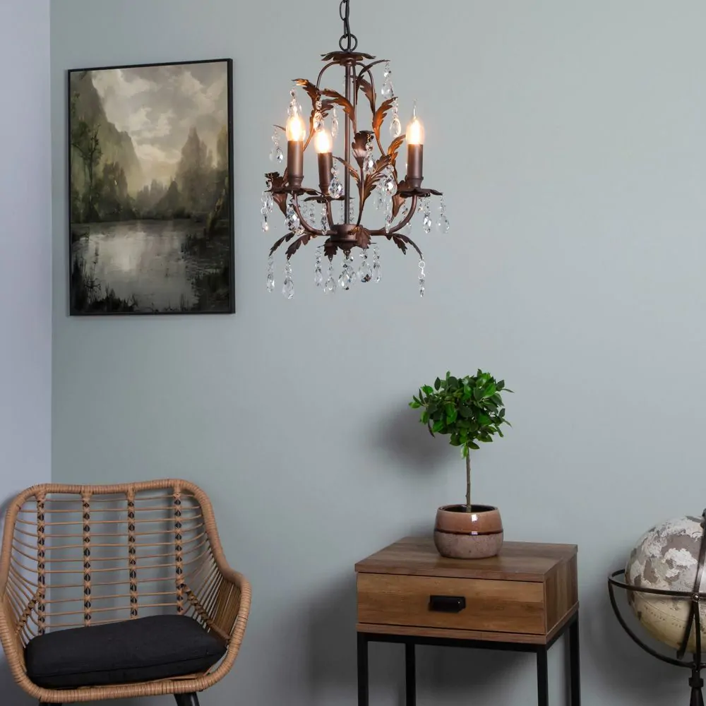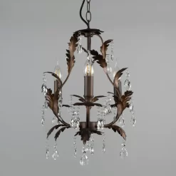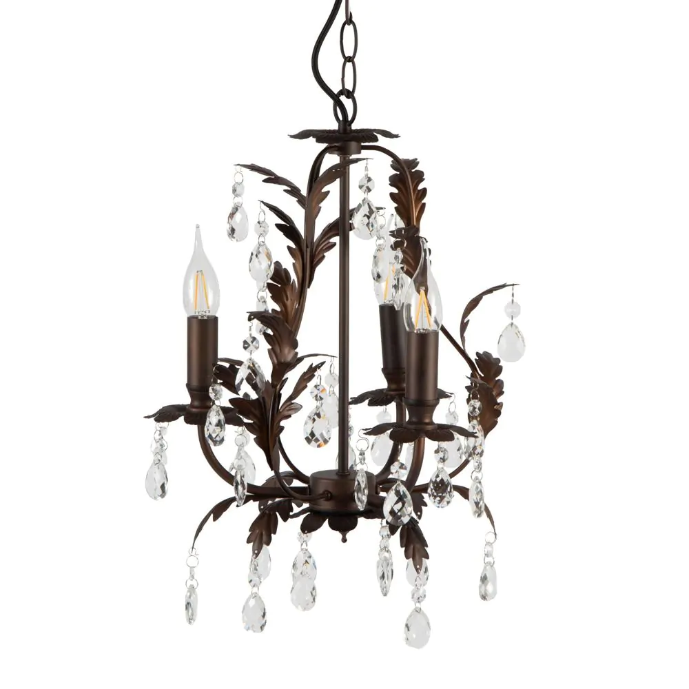 Rustic lighting design for your interior décor with the Cristalo 3 Light Chandelier. This chandelier is finished in bronze for a refined and distinguished aesthetic that looks beautiful in countryside, cottage, or farmhouse-type homes. It also comes adorned with crystal effect droplets which reflect the light for a sparkling appearance, and features a frame decorated with a sculpted leaf design for an elegant feel to any home.