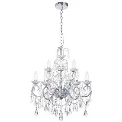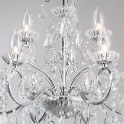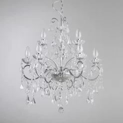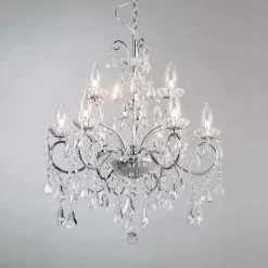 The Daphne 9 light chandelier is a gorgeous addition to any décor, including the bathroom thanks to added protection and a suitable IP44 rating for those spaces. A modern chrome finish gives an urban twist to this eye-catching fitting, which hangs from a chain for a bolder look. Hanging crystal droplets surround the lights, which sit in sconces for a more decorative feel, adding elegance to the interior.