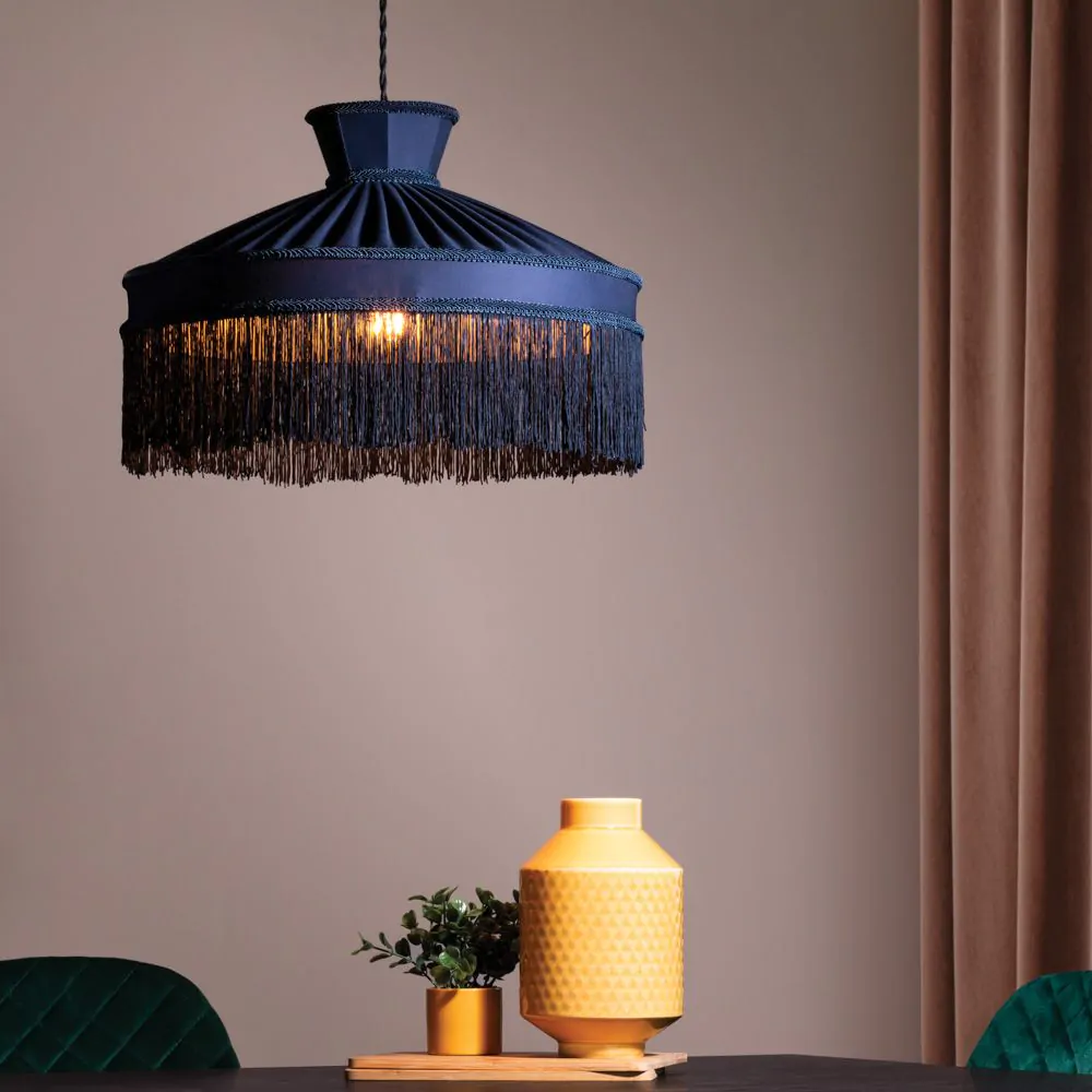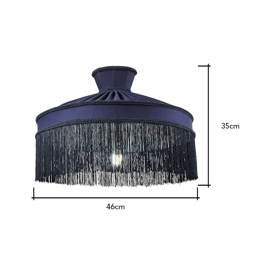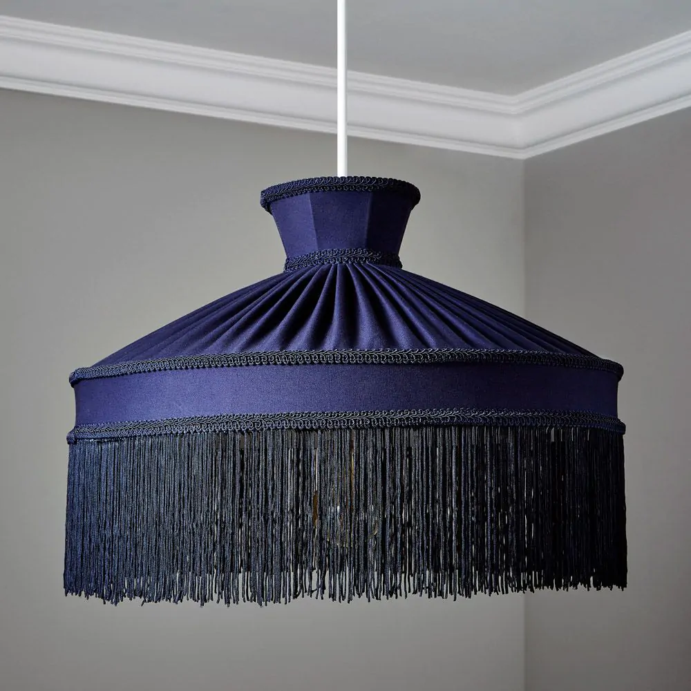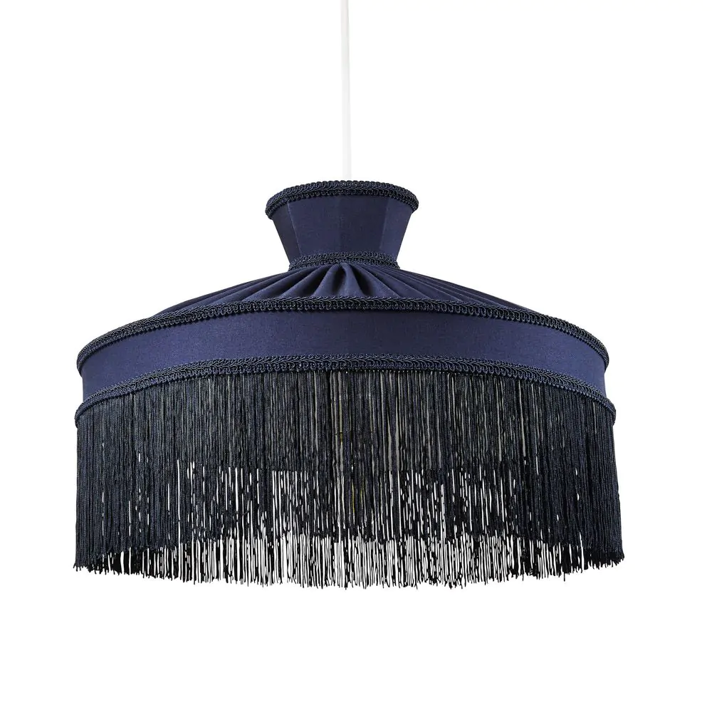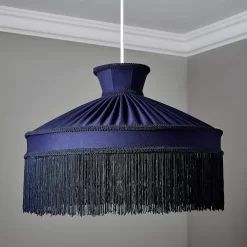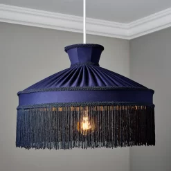 For a flair of dark elegance in your interiors, our Darcy Fringed Easyfit Shade is perfect – featuring a beautiful, traditional style with a gorgeous arrangement of soft, cascading fringe from which the light within provides a warming glow. Finished in dark blue, this uniquely fashioned lighting accessory adds a mood lighting touch to your interior arrangements, and is perfect for use in the living room or bedroom.