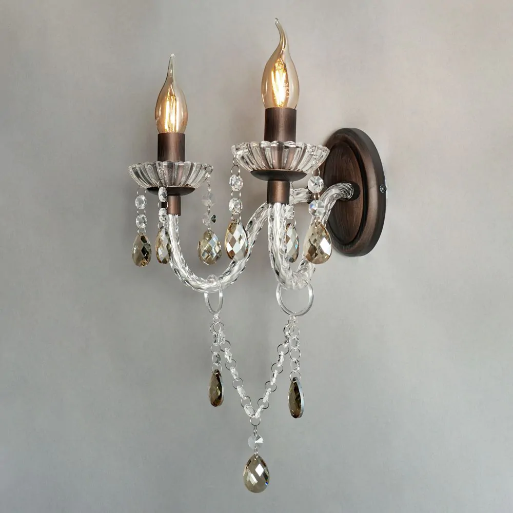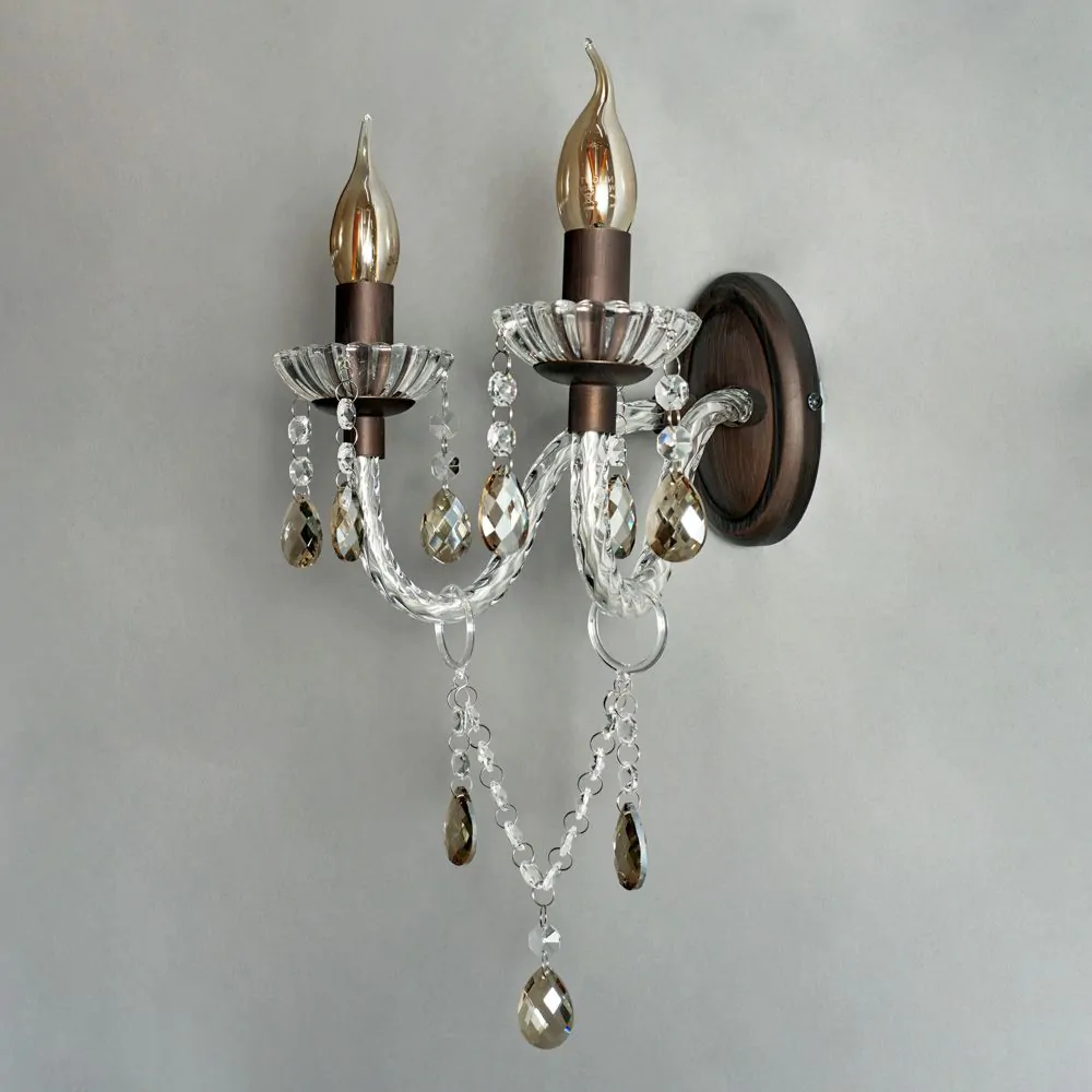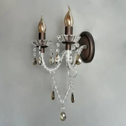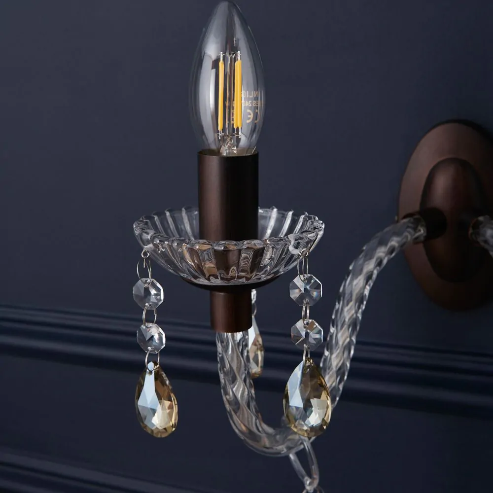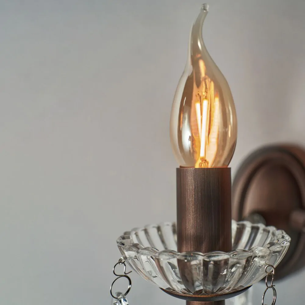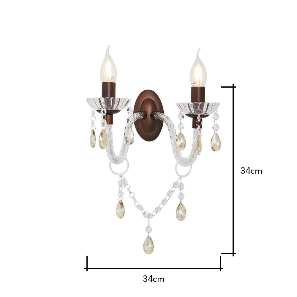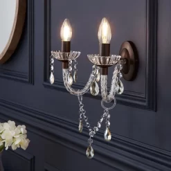 Get gorgeous accent lighting designs for your home décor with the Darlia 2 Light Wall Light. This wall light comes in a bronze finish and features a classical candle sconce design for a feeling of elegance in your home. It also comes adorned with crystal effect droplets and beading which sparkle as they reflect the light out, looking ideal when styled on either side of a bed, hallway, or mirror.