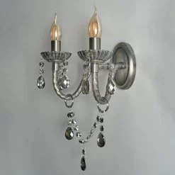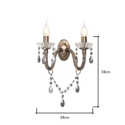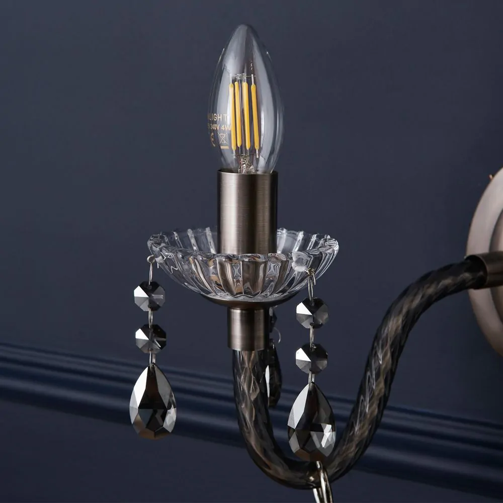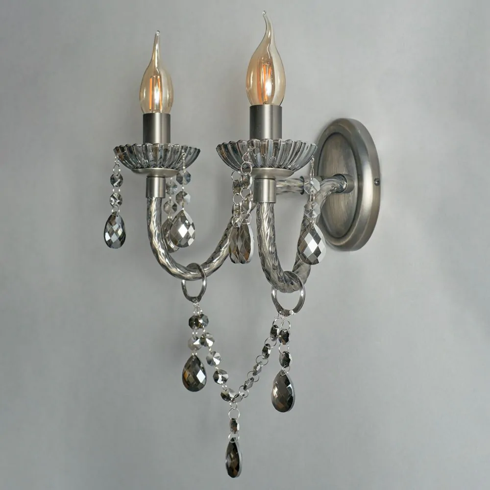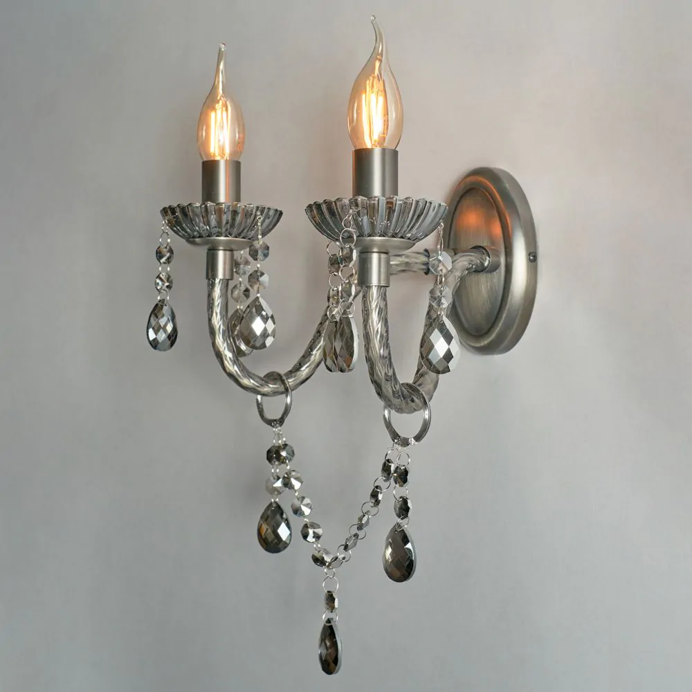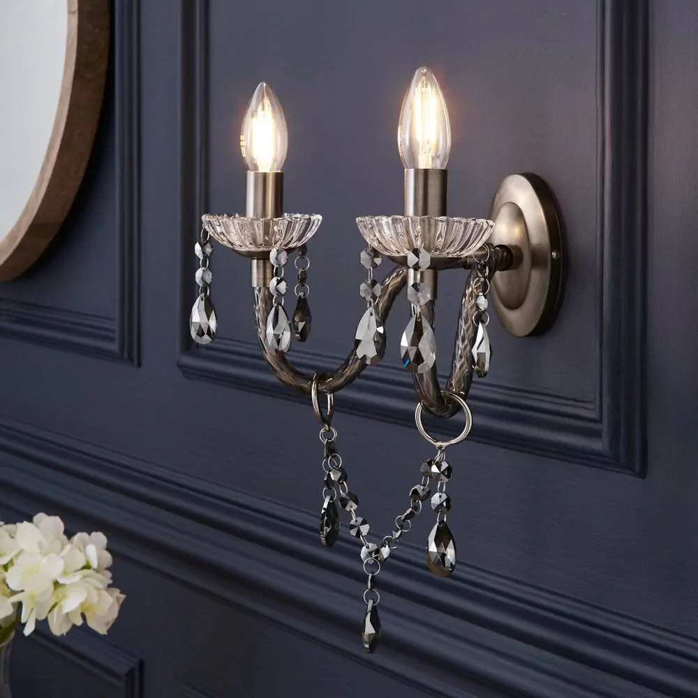 Bring a glamorous touch to your living room or bedroom with the Darlia 2 Light Wall Light. This wall lamp comes in a pewter finish for a refined sophisticated appearance and looks ideal when styled in pairs on either side of a bed, hallway, or mirror. It also comes decorated in stunning smoke tinted crystal effect droplets which sparkle as they reflect the light outwards, and features traditional style candle-like sconces for a classic elegance to your home.