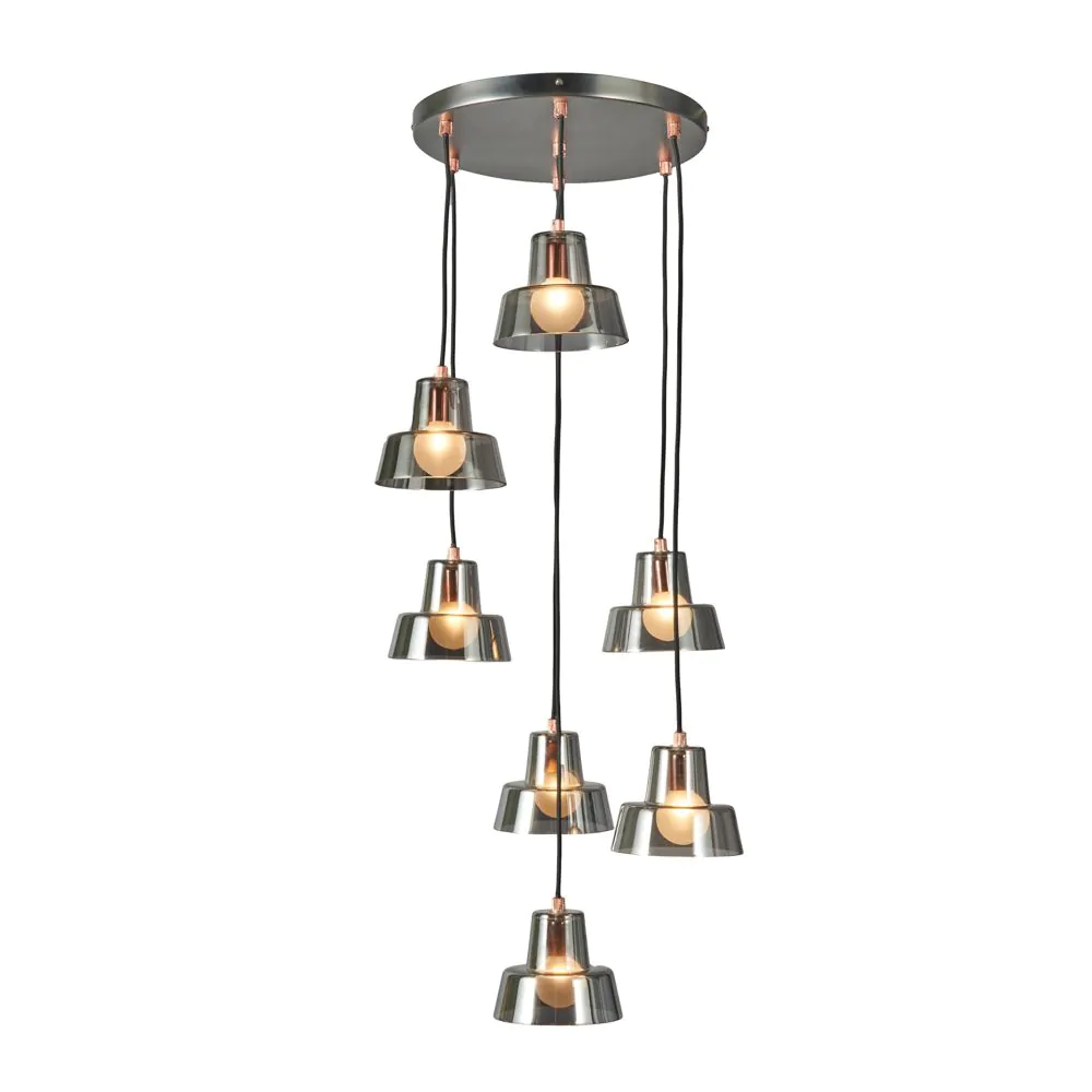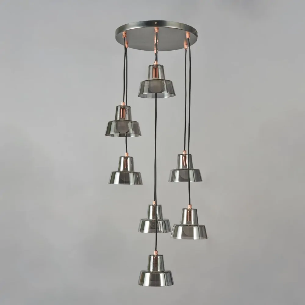 Make a statement with the Demi 7 Light Conical Glass in Matte Black and Copper. Its striking conical glass shade design combines modern aesthetics with a touch of industrial charm. The interplay between the matte black frame and copper accents adds a unique flair to your living space, with the cascading pendant effect offering an eye-catching look to any stairwell or kitchen island.