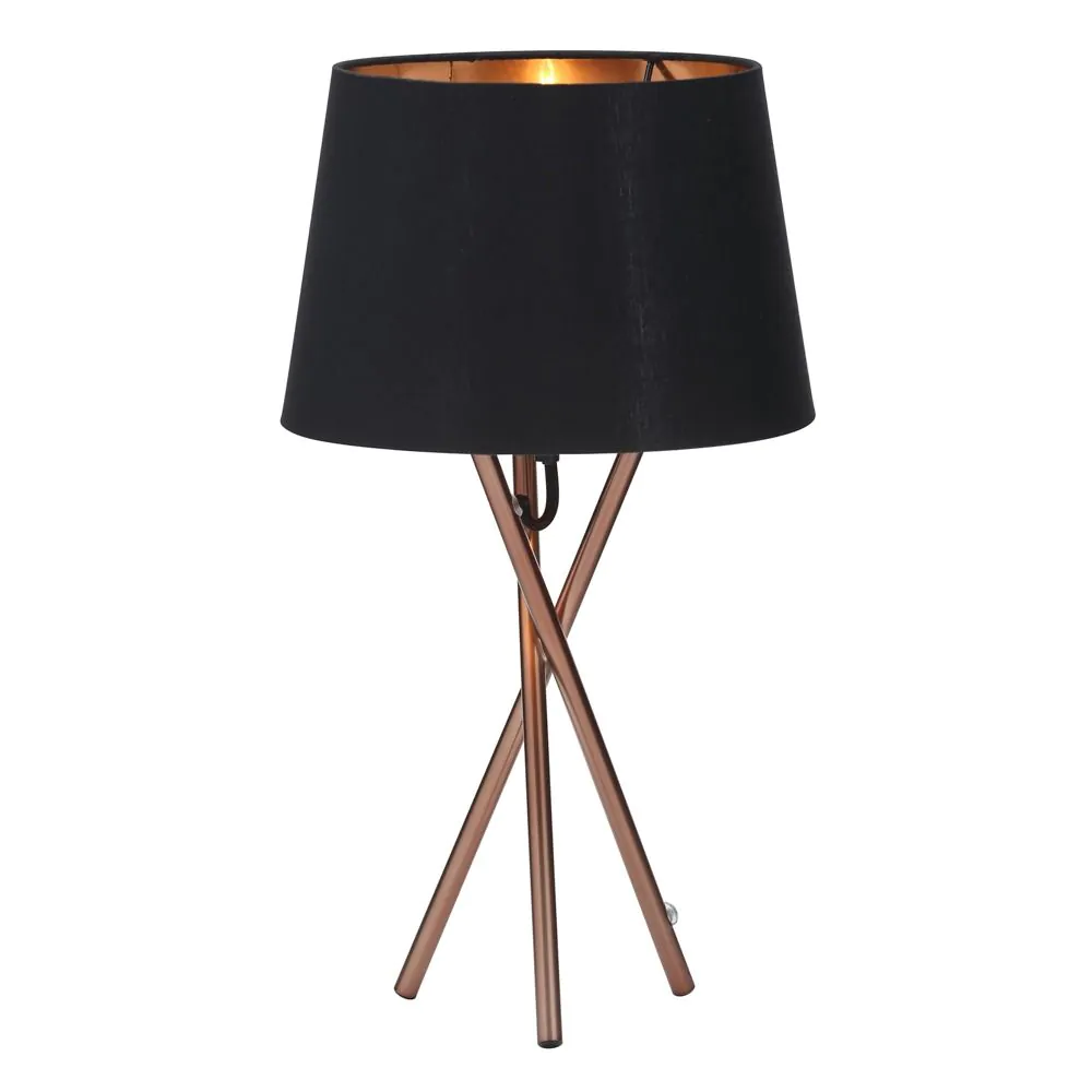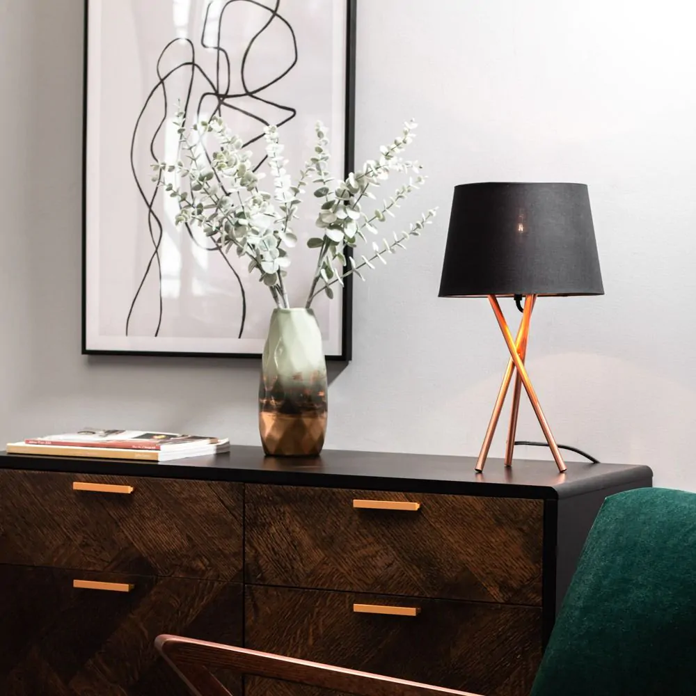 The Drey Table Light is a wonderful addition to your home’s interior lighting arrangements. Finished in copper, the table lamp features 3 straight legs angled and overlapping one another to create a unique, abstract feature. Atop the three legs sits a minimal, classic black shade from which the warm light diffuses through the fabric to create a much softer glow that provides a relaxing atmosphere in your spaces.