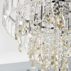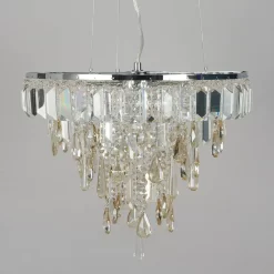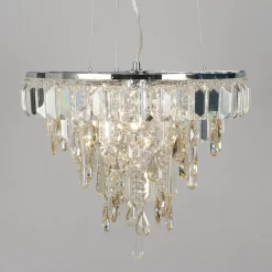 Statement lighting design for your interior with the Eleanor Champagne Crystal Pendant. This showstopping ceiling light comes in a sleek chrome finish to add a modern aesthetic to your home and looks ideal when styled over any kitchen island or dining room table for a glamorous appearance. It also comes decorated in tiers of clear and champagne tinted crystal effect droplets which sparkle as they reflect the light from within.