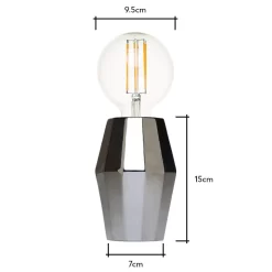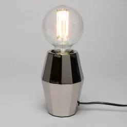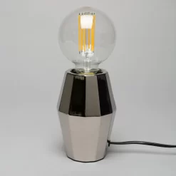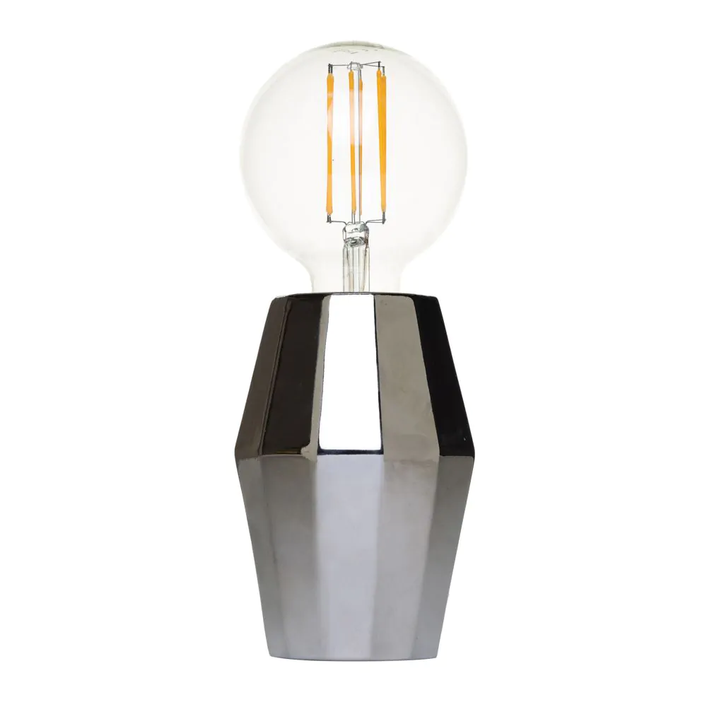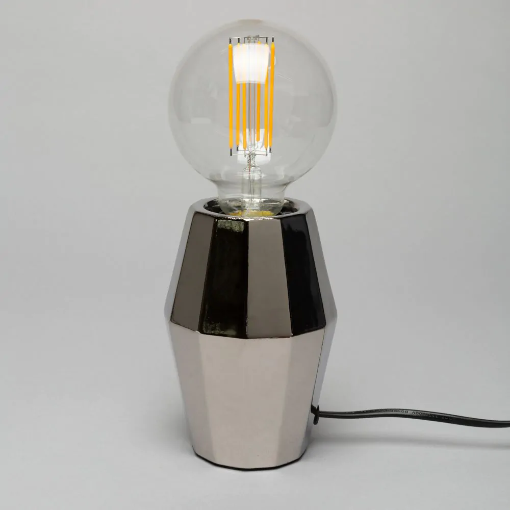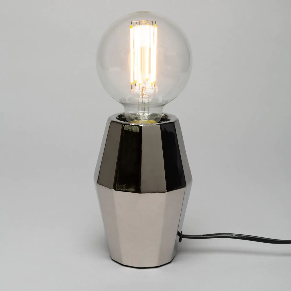 The Elm Silver Geometric Base Table Lamp will add a classy, contemporary feel to any home. The geometric styling on the base is stunning and really catches your eye. The silver finish of this table lamp allows it to blend with many different decor or styling choices. Featuring an exposed bulb at the top of the base, this table lamp gives off a warm, subtle glow across your room.