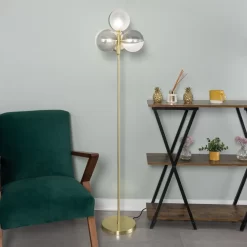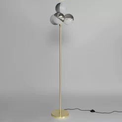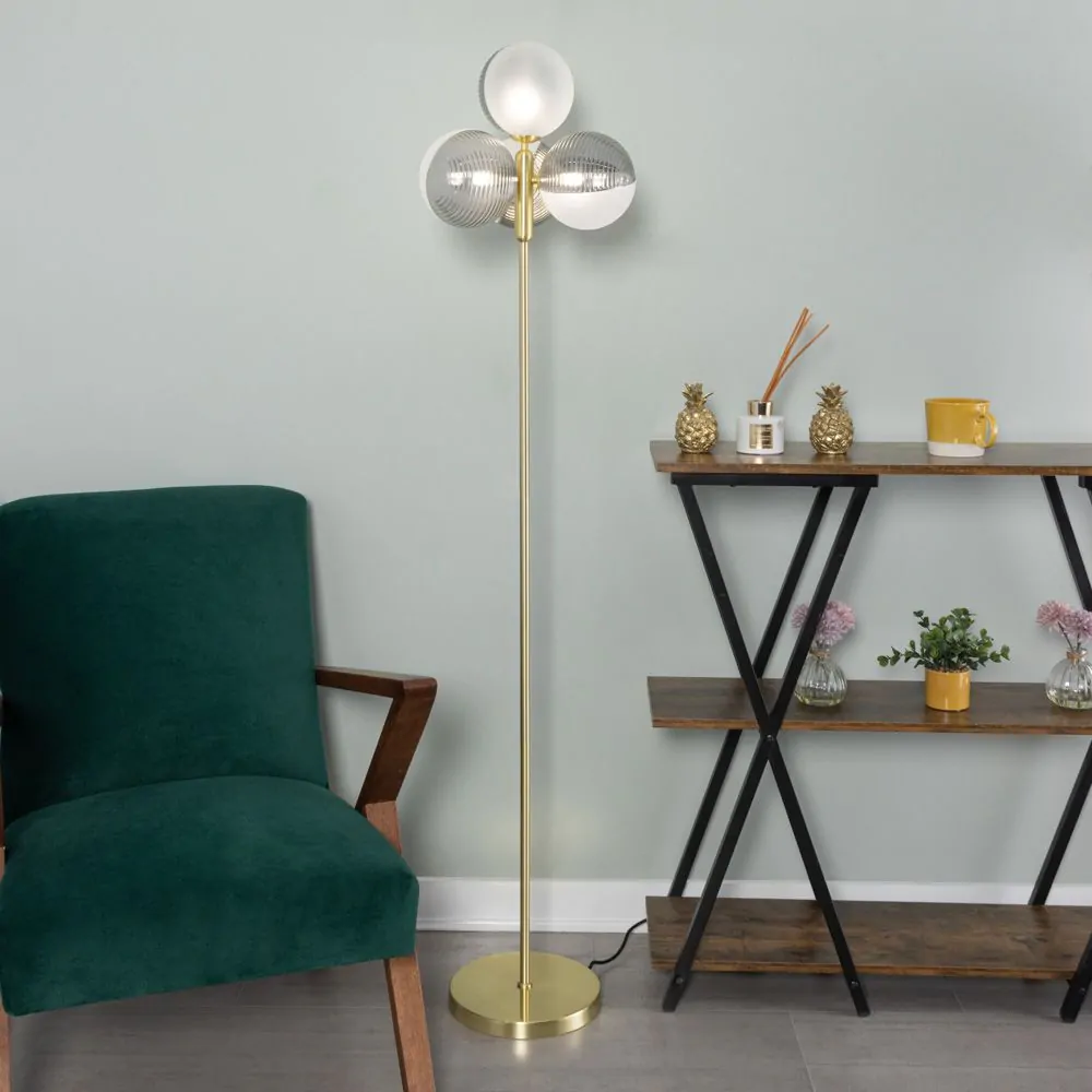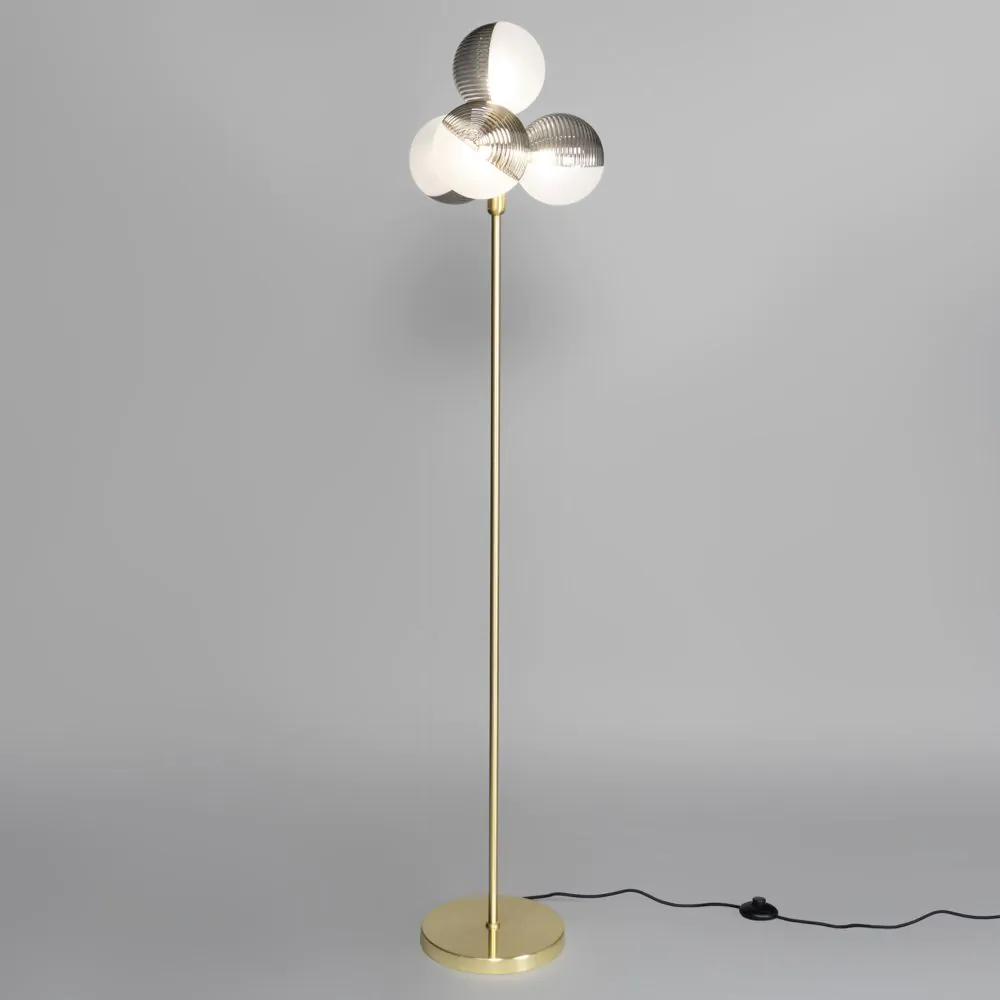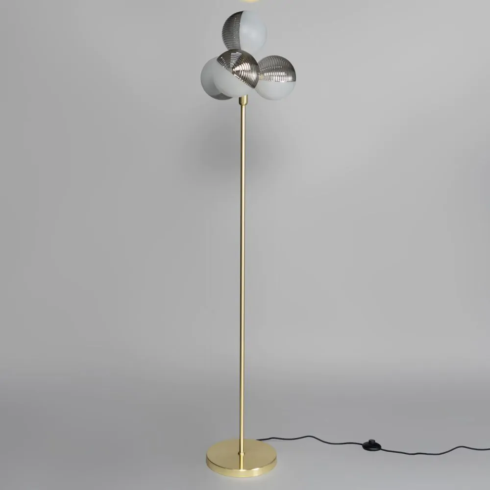 Art deco lighting design for your living room with the Emile Floor Lamp with Smoked and Opal Glass Shades. This floor lamp comes in a stunning brass finish for an opulent aesthetic and features a 4 light design with spherical half opal glass, half ribbed smoke glass for a unique appearance. It also looks ideal when styled next to a couch or chair in a living room, or next to a desk or bed in the bedroom.