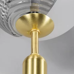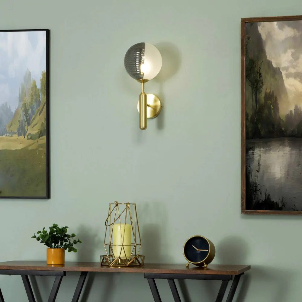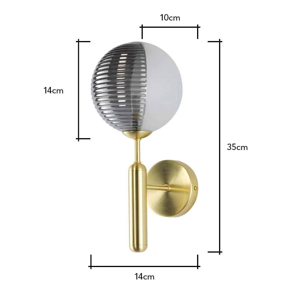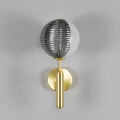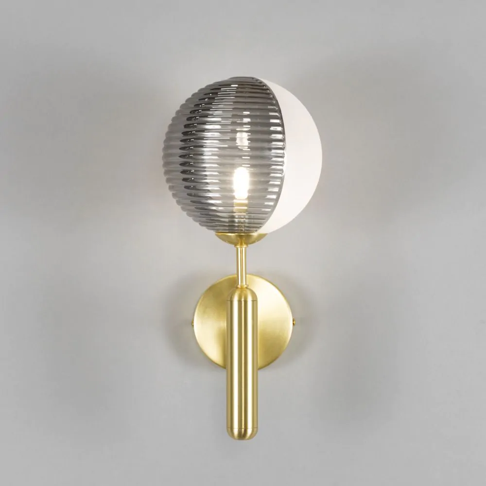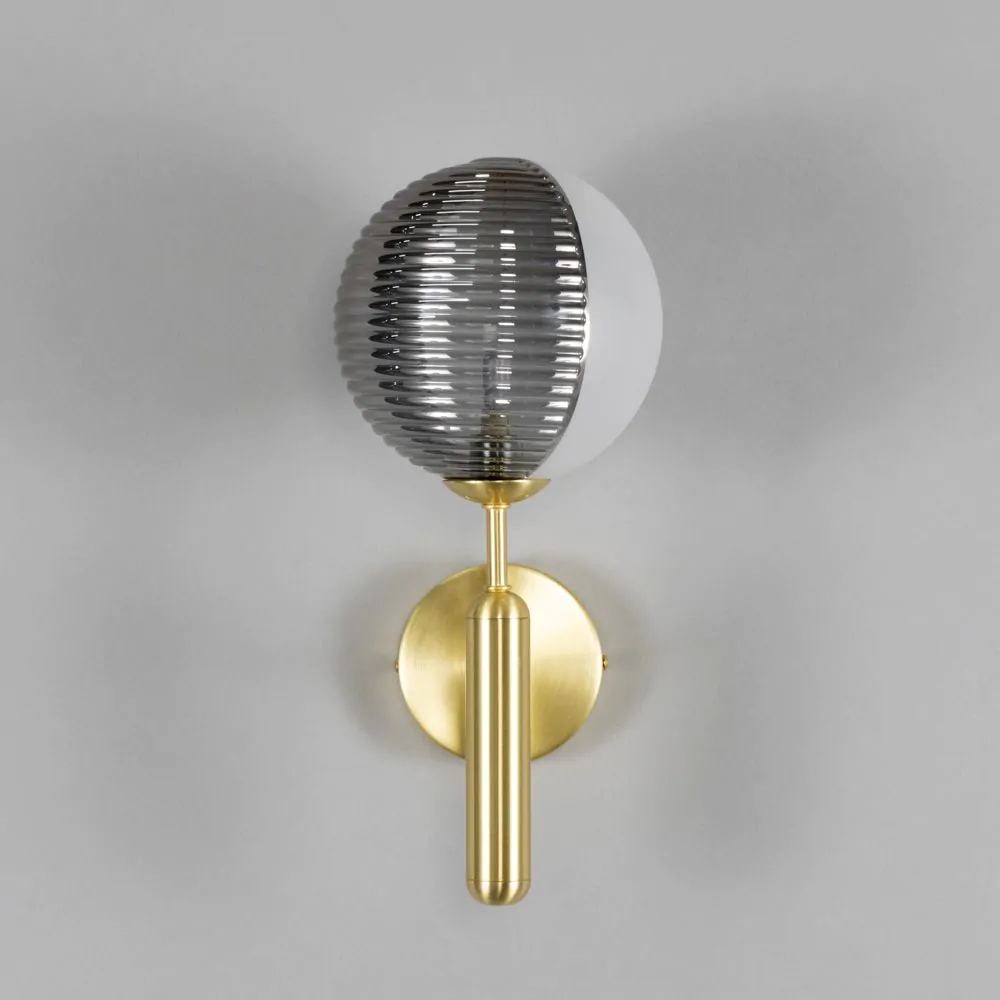 Bring a stylish accent light to your home with the Emile Wall Light with Smoked and Opal Glass Shades. This wall light looks ideal when styled in pairs on either side of a hallway, bed, or mirror for a symmetrical appearance. It also comes in a satin brass finish for a post modern aesthetic and features a spherical half opal glass, half ribbed smoke glass shade for a warm light diffused outwards.