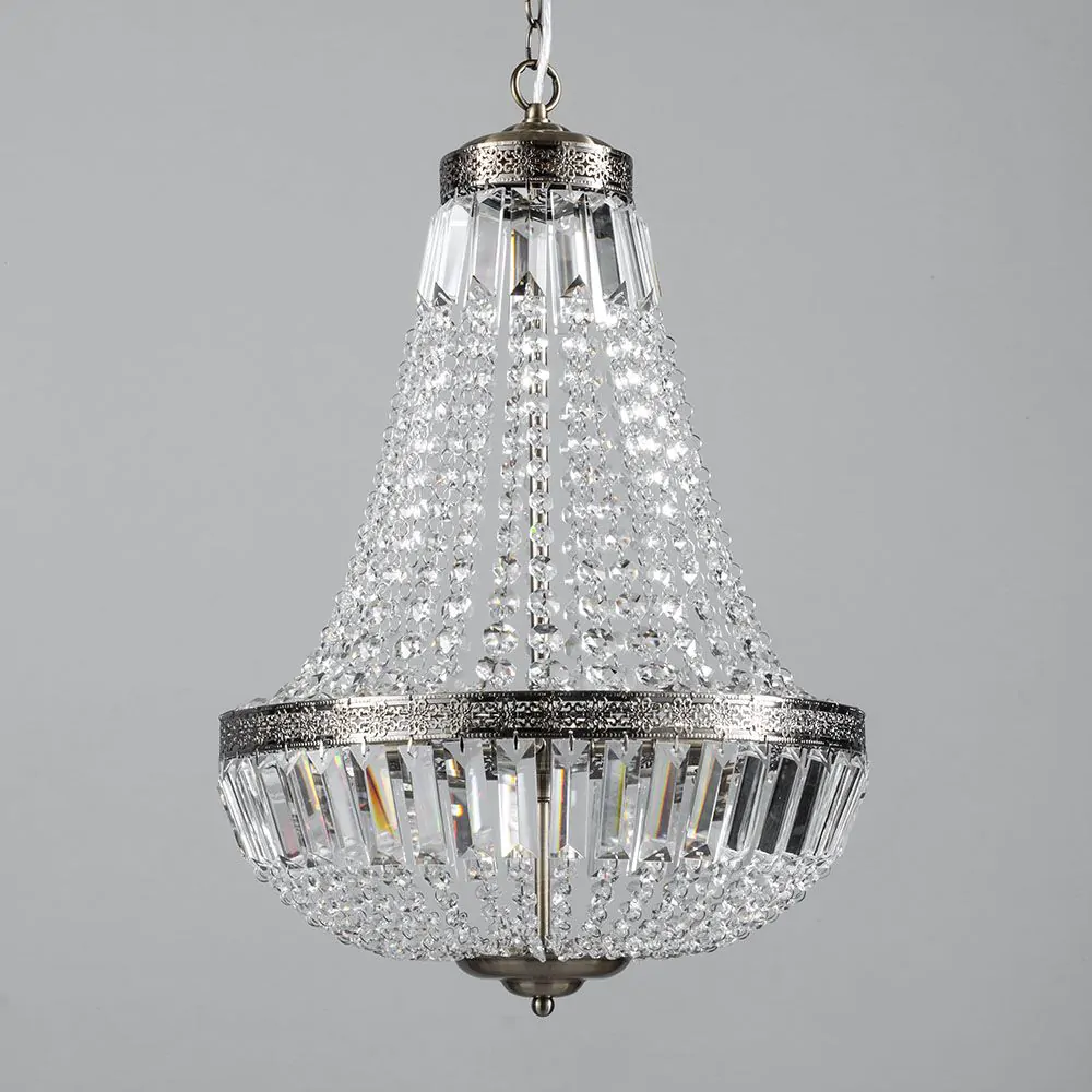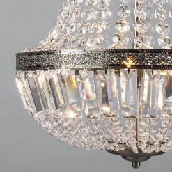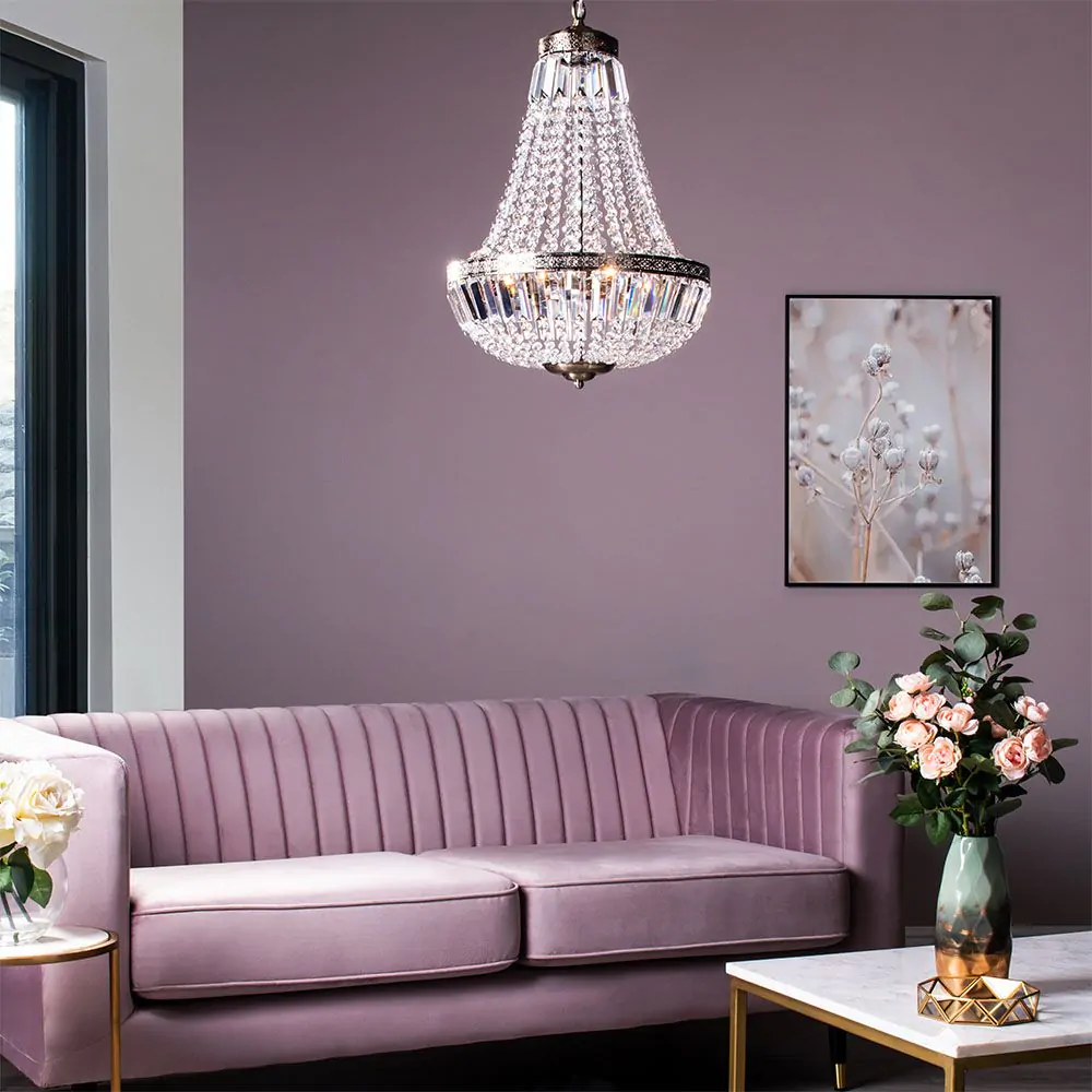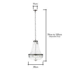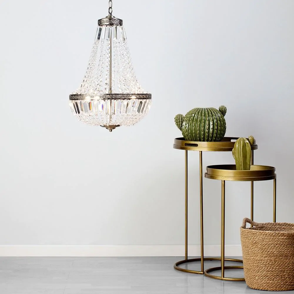 With Esmeralda you’ll get a classic look that’s perfect for bringing an elegant feel into your home. The fitting has an antique brass structure that’s surrounded by a collection of elegant crystal effect beading – these catch the light as it shines through them and gives a gorgeous twinkle and shimmer to the fitting. Hanging from a chain, the pendant is a perfect statement piece for your sophisticated dining room or lounge décor.