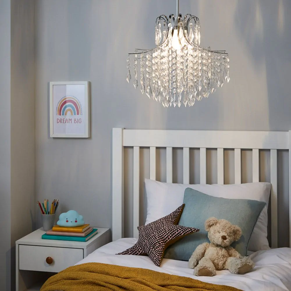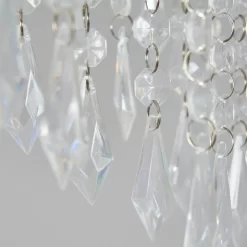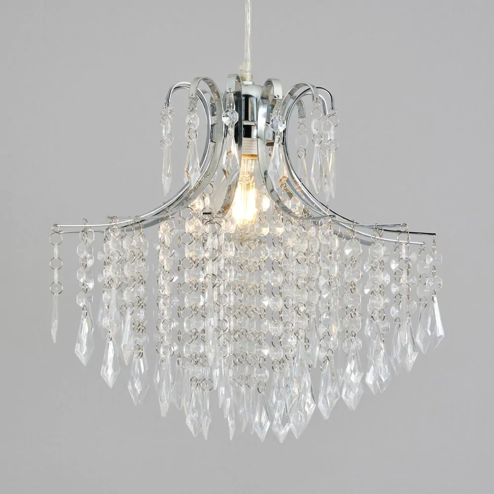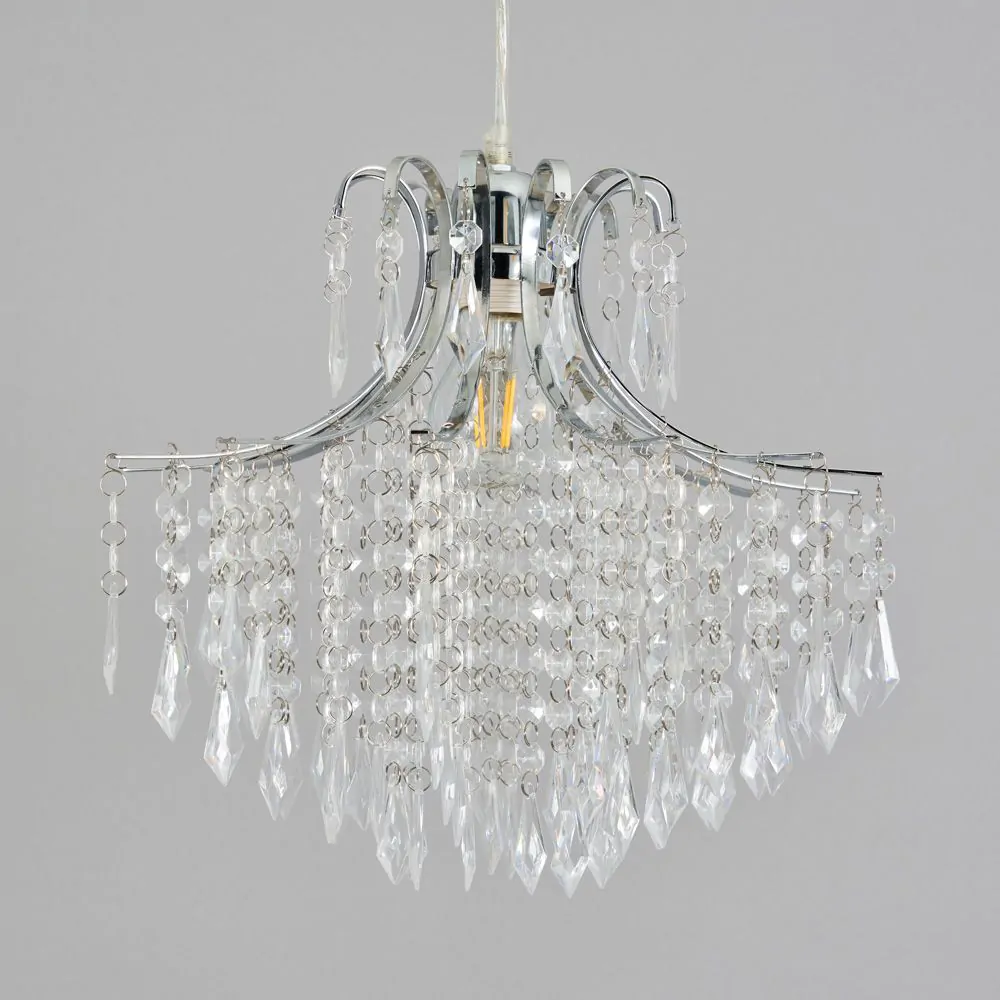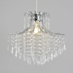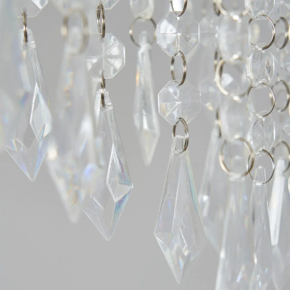 Elevate your home decor with our Glow Acrylic Droplet Easy Fit Shade and bask in the enchanting glow it brings to your space. This exquisite shade features cascading acrylic droplets that catch the light beautifully, creating a mesmerizing display. The easy fit design allows for effortless installation – simply attach it to your existing light fittings. The Acrylic Droplet Light complements various decor styles, adding a touch of elegance and glamour to any room. Transform your space with this stunning ceiling light and create a captivating ambience in your room, while adding a sparkling centrepiece.