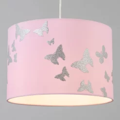 Add a gorgeous lampshade to your children’s bedroom with the Butterfly Shade in pink. This lampshade features a beautiful reflective butterfly design and is ideal for lighter coloured bedrooms. It also can easily fit onto pre-existing light fittings and diffuses a warm glow into the room.