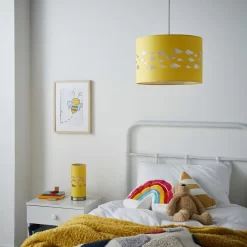 Add a vibrant pop of colour to your child’s bedroom or playroom with the Clouds Light Shade in Ochre. This lampshade is easy to fit meaning that it can be used to quickly update bare pendant light fittings, easily screwing into place. It also features a dreamy cut out design which projects light in the shape of clouds across the room.