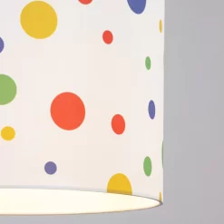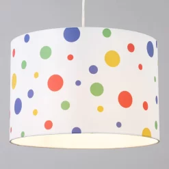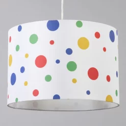 Add a joyful look to your child’s bedroom or playroom with this Coloured Dots Light shade. This children’s light shade comes in a crisp white colour with vibrant multicoloured polka dots, making it the ideal nursery shade, diffusing a calming illumination into the room. This lampshade can be used as both a ceiling shade and a table lamp shade with a separately sold table lamp base, looking perfect in gender neutral rooms.
