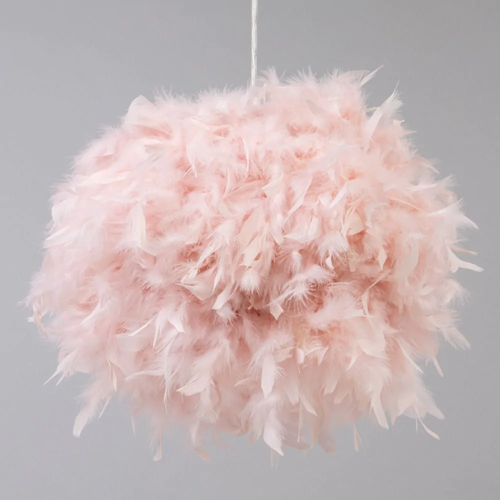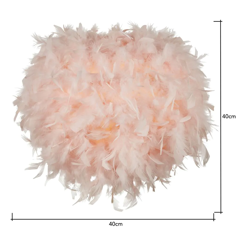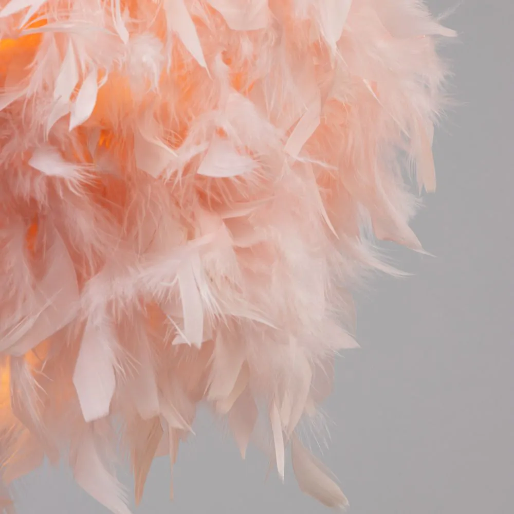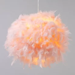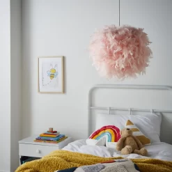 Soft and warm lighting looks for children’s rooms with the Feather Easy fit Shade. This Lampshade is covered in a plethora of fluffy pink feathers, looking ideal in pink bedrooms or lighter colour schemes. It also diffuses a warm glow into the room and is ideal for updating any existing pendant light fittings.