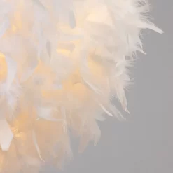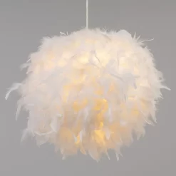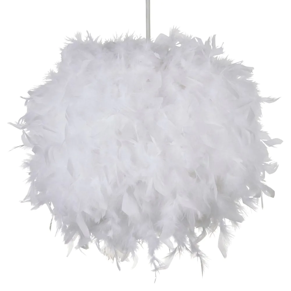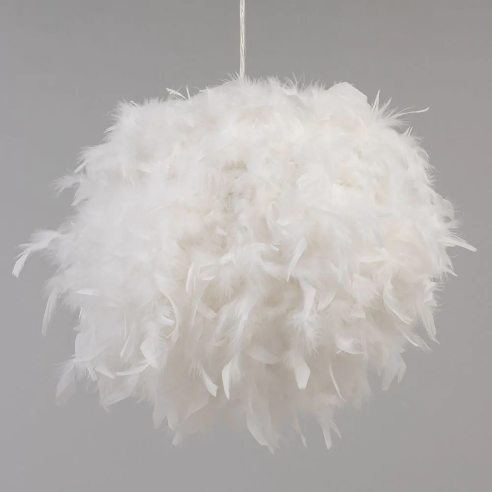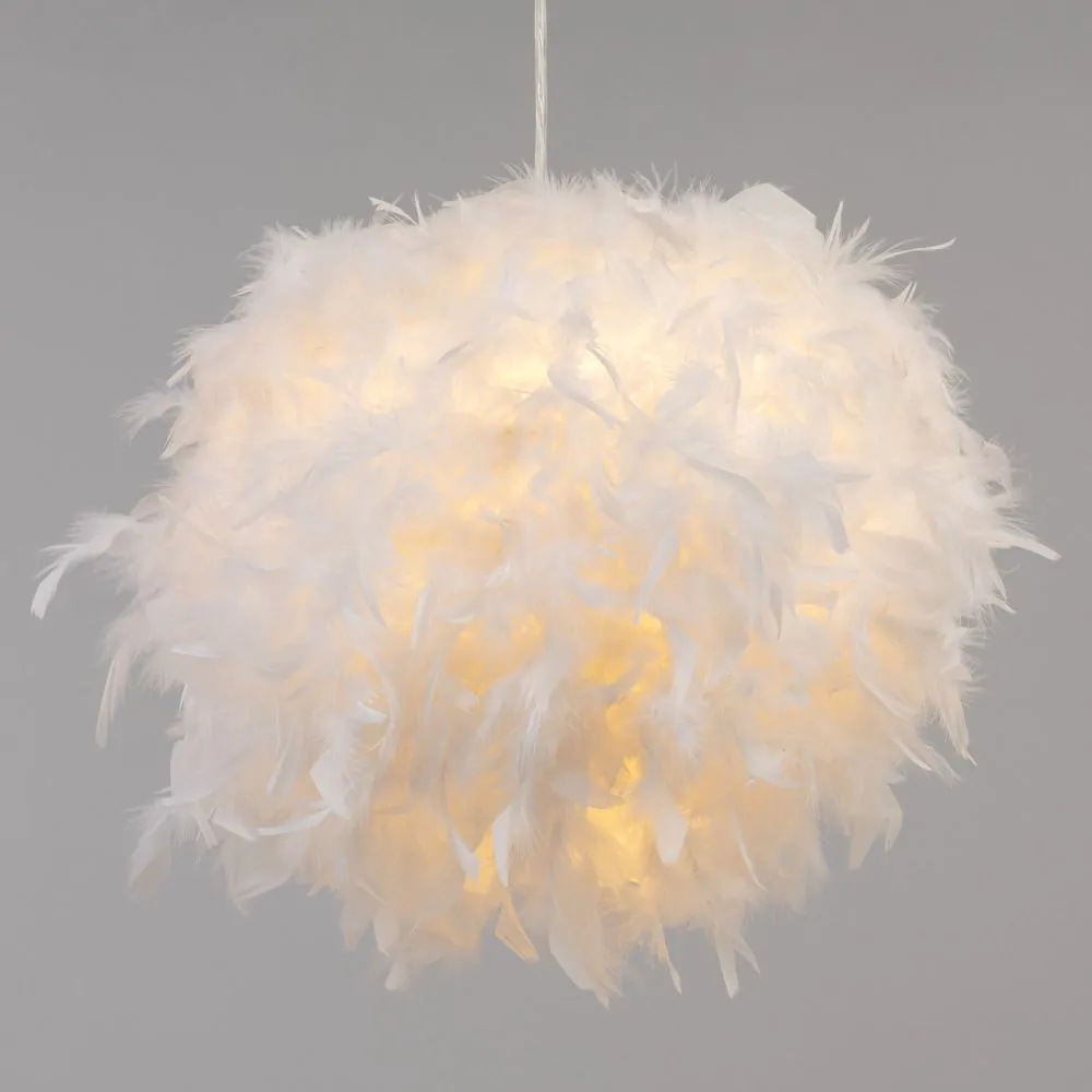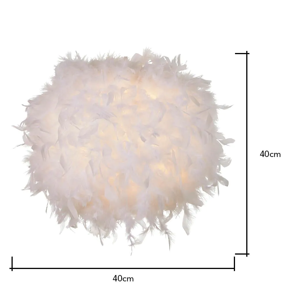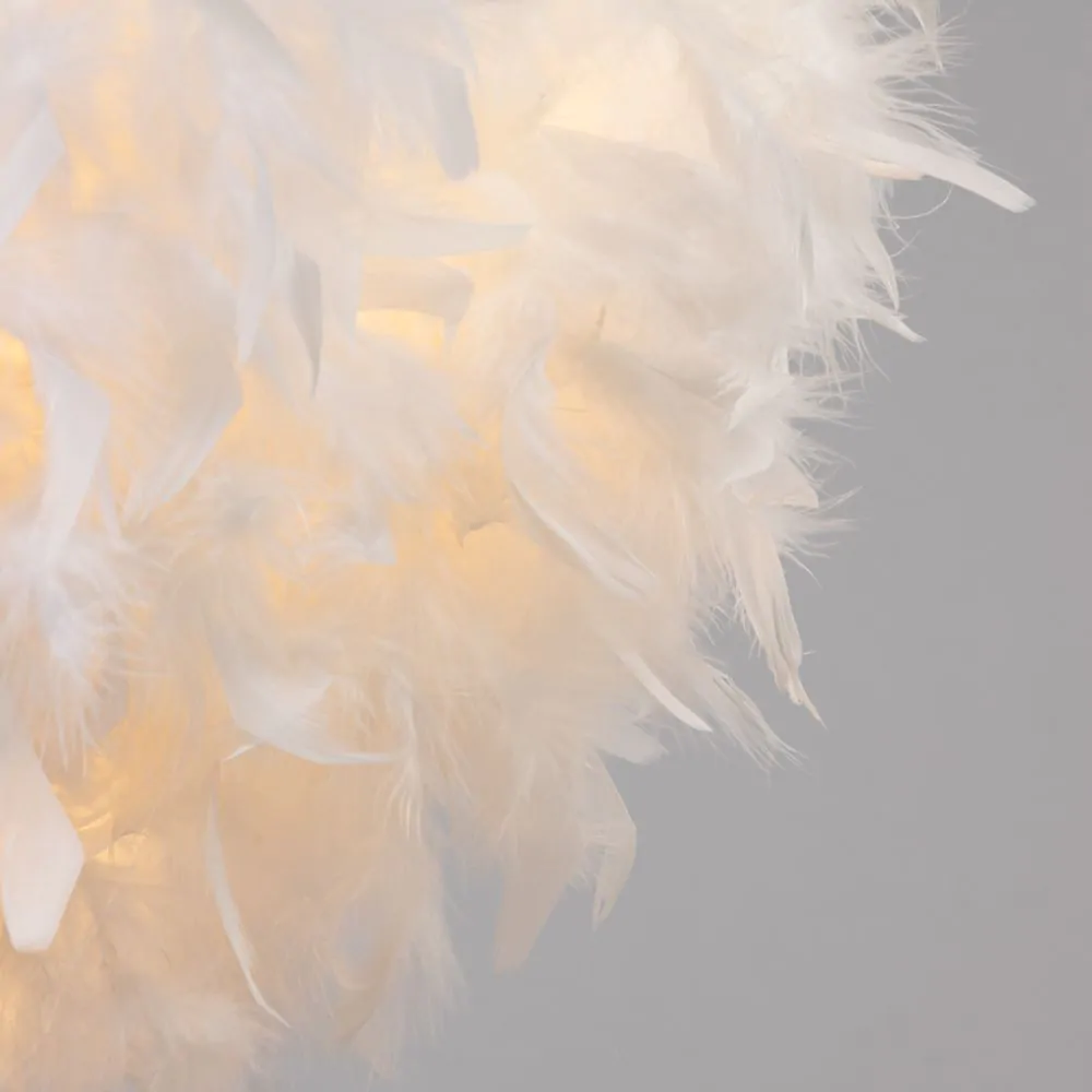 Warm and comforting lighting looks for children with the Feather Easy fit Shade. This lampshade is covered in fluffy white feathers for a cosy and fun appearance, diffusing a calming ambience into the room. It is also ideal for updating pre-existing light fittings due to the easy fit function.