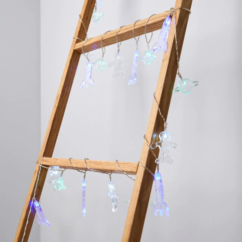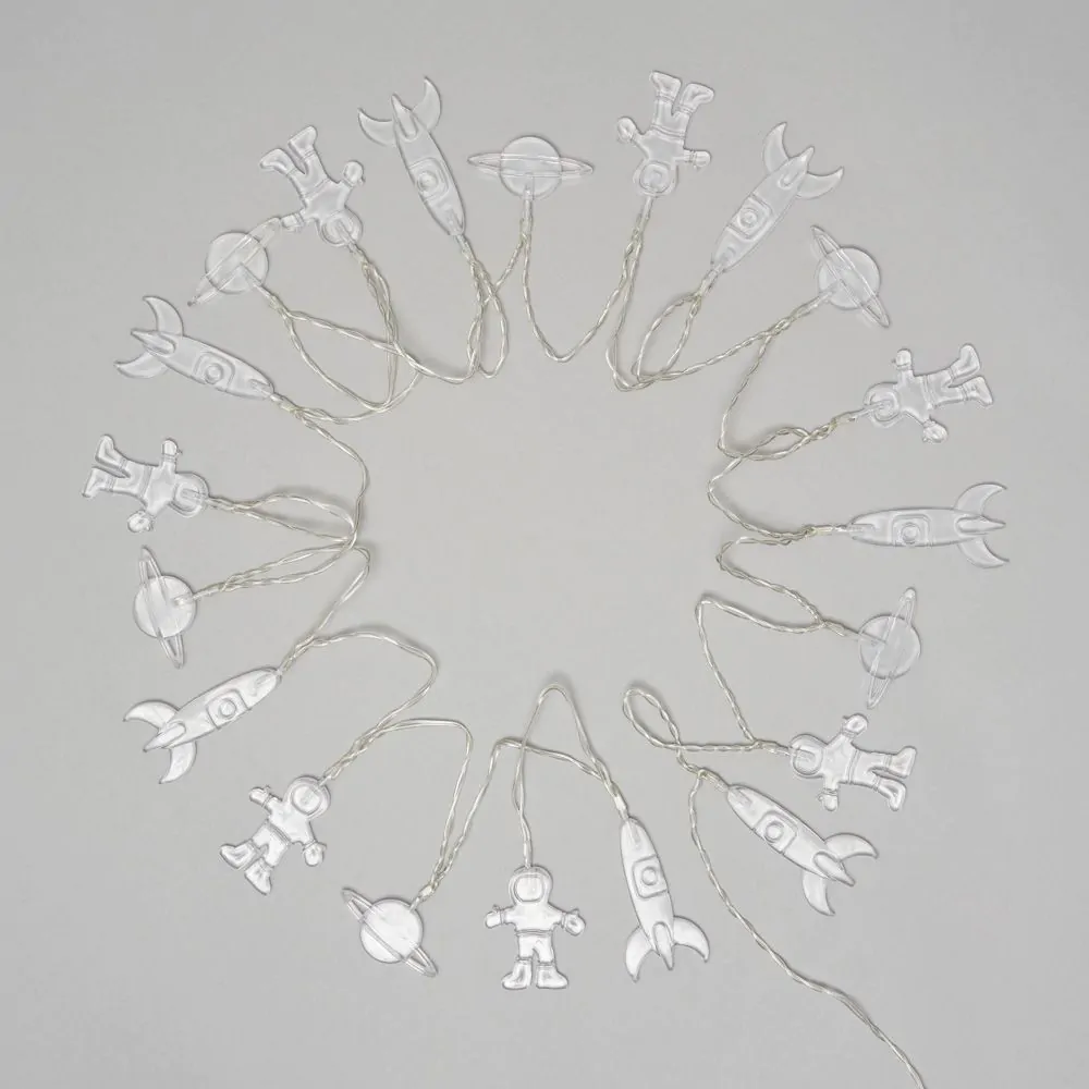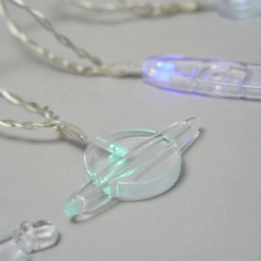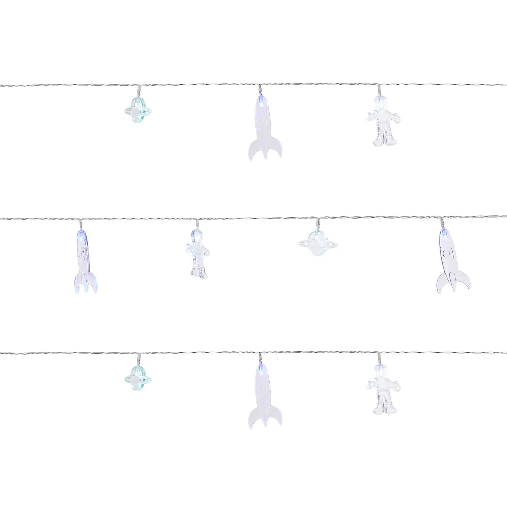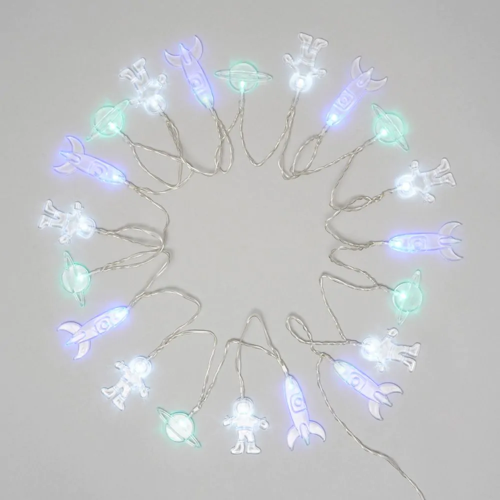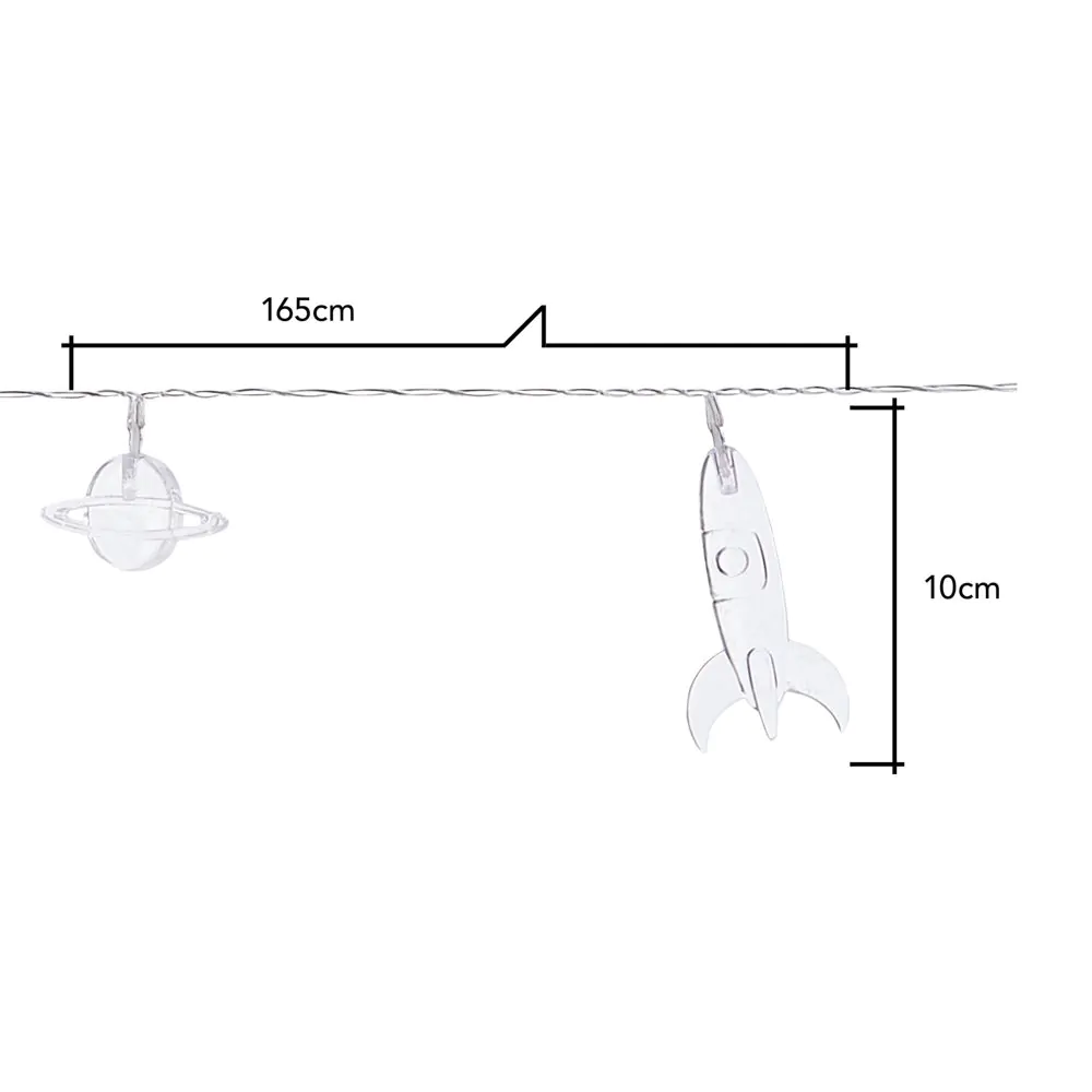 Upgrade your interior decor with a touch of celestial charm with our enchanting Glow LED Space String Lights. These captivating lights feature a collection of rockets, spacemen, and planets, creating a magical atmosphere wherever they’re displayed. Perfect for adding a whimsical touch to bedrooms, nurseries, or for use as party decorations. These funky string lights are perfect for adding a subtle glow of light that can be used as a night light too.