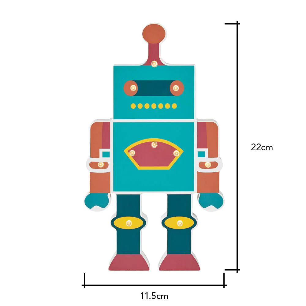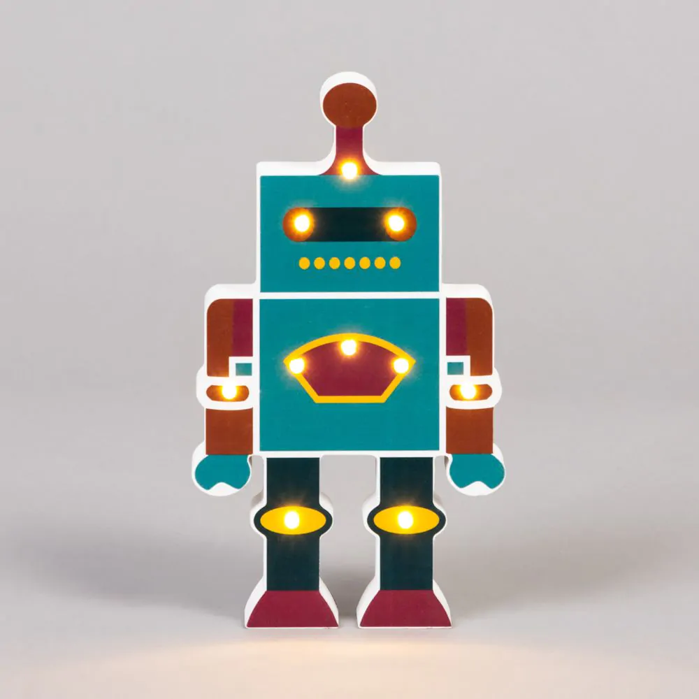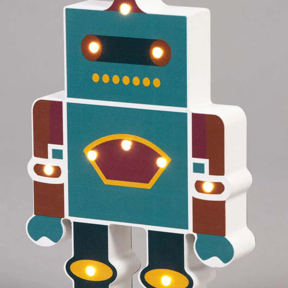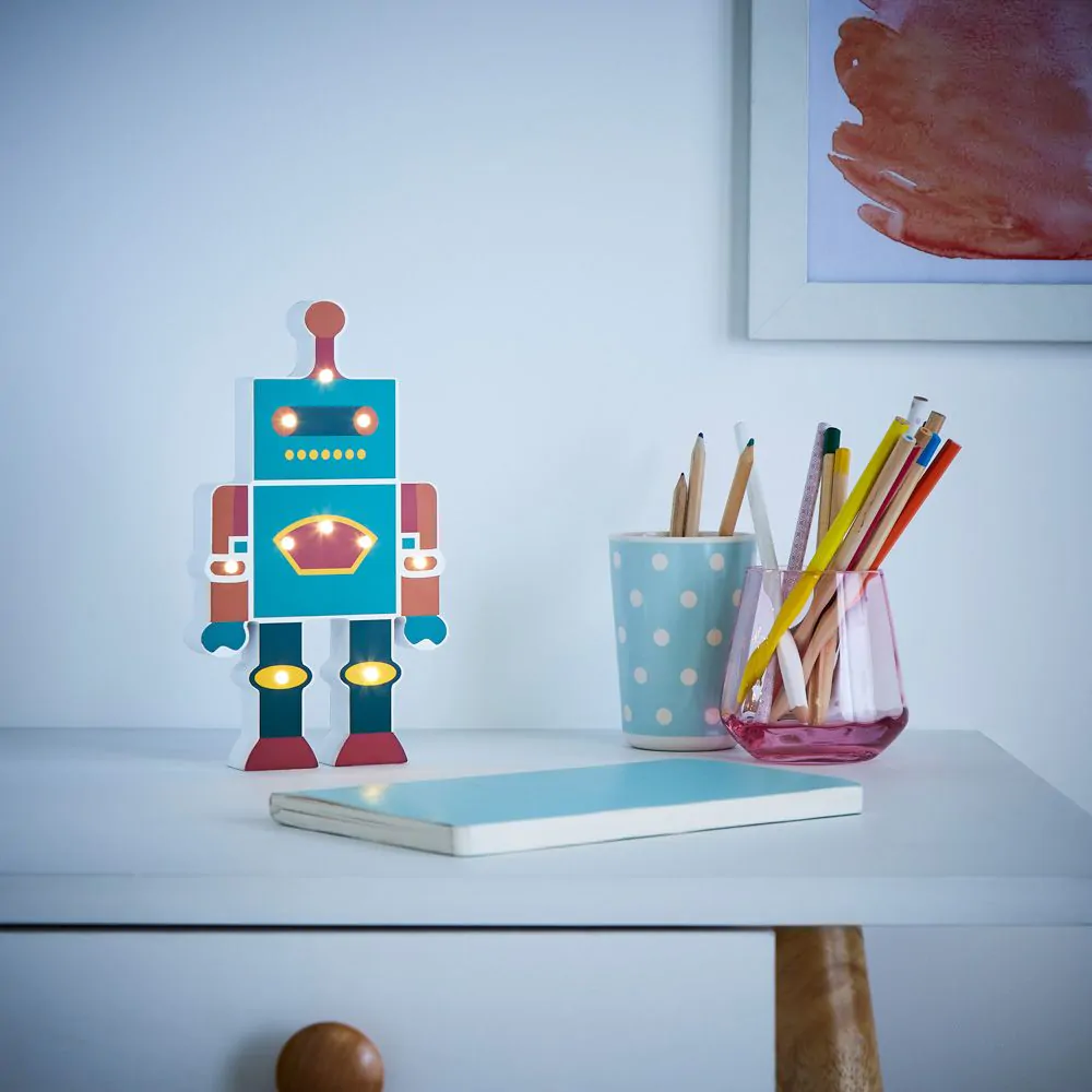 Retro children’s lighting for nurseries and bedrooms with the Robot Table Lamp. This table lamp is battery operated and features singular LEDs that are dotted about the design for a novelty look. With a robot design that is finished in blue red and yellow colours, this lamp is guaranteed to add a fun appearance to any bedside table.