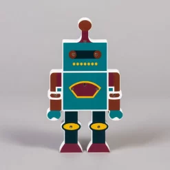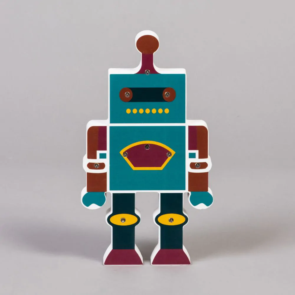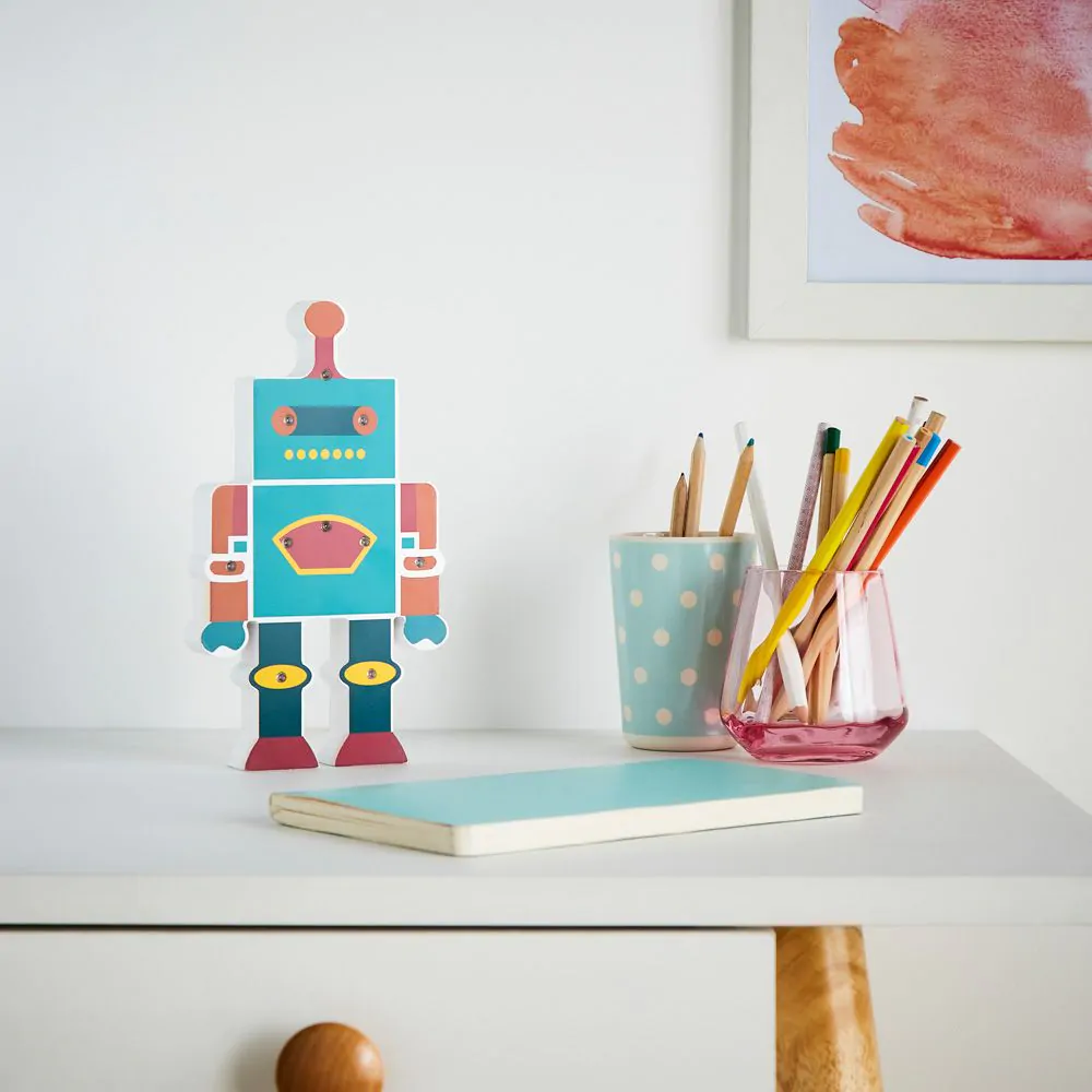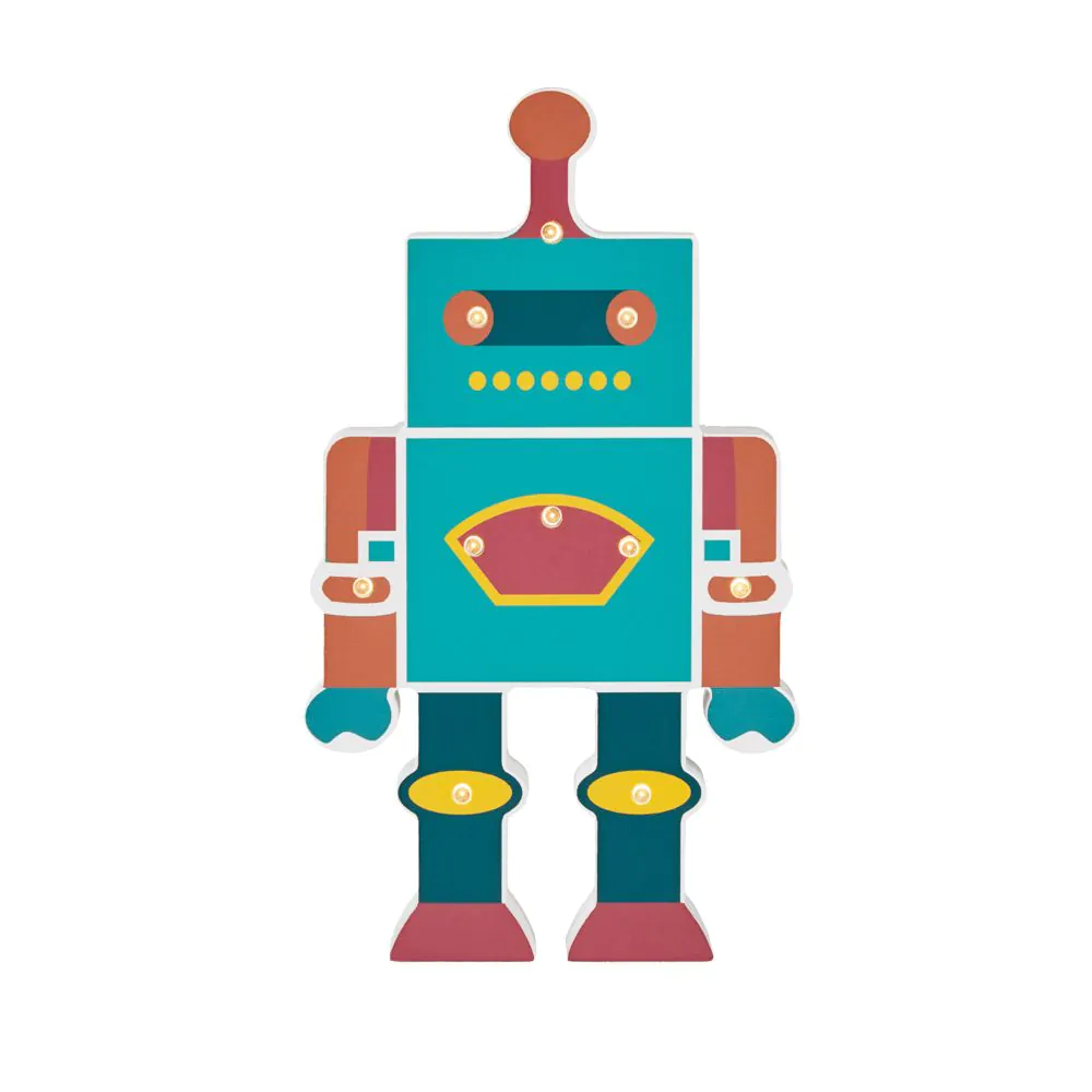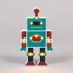 Retro children’s lighting for nurseries and bedrooms with the Robot Table Lamp. This table lamp is battery operated and features singular LEDs that are dotted about the design for a novelty look. With a robot design that is finished in blue red and yellow colours, this lamp is guaranteed to add a fun appearance to any bedside table.