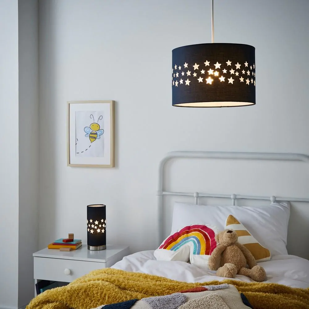 Add a fun space theme to your child’s bedroom with the Stars Table Lamp in Navy. This table lamp features a creative cut out design which projects light in the shape of stars across the room for a mesmerising appearance. It also comes in a navy colour which fits perfectly with dark rooms.