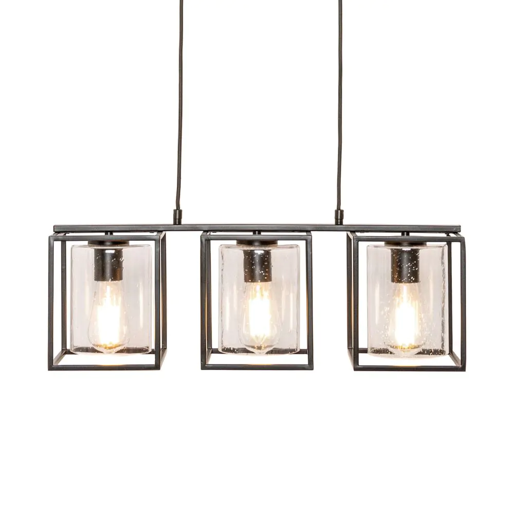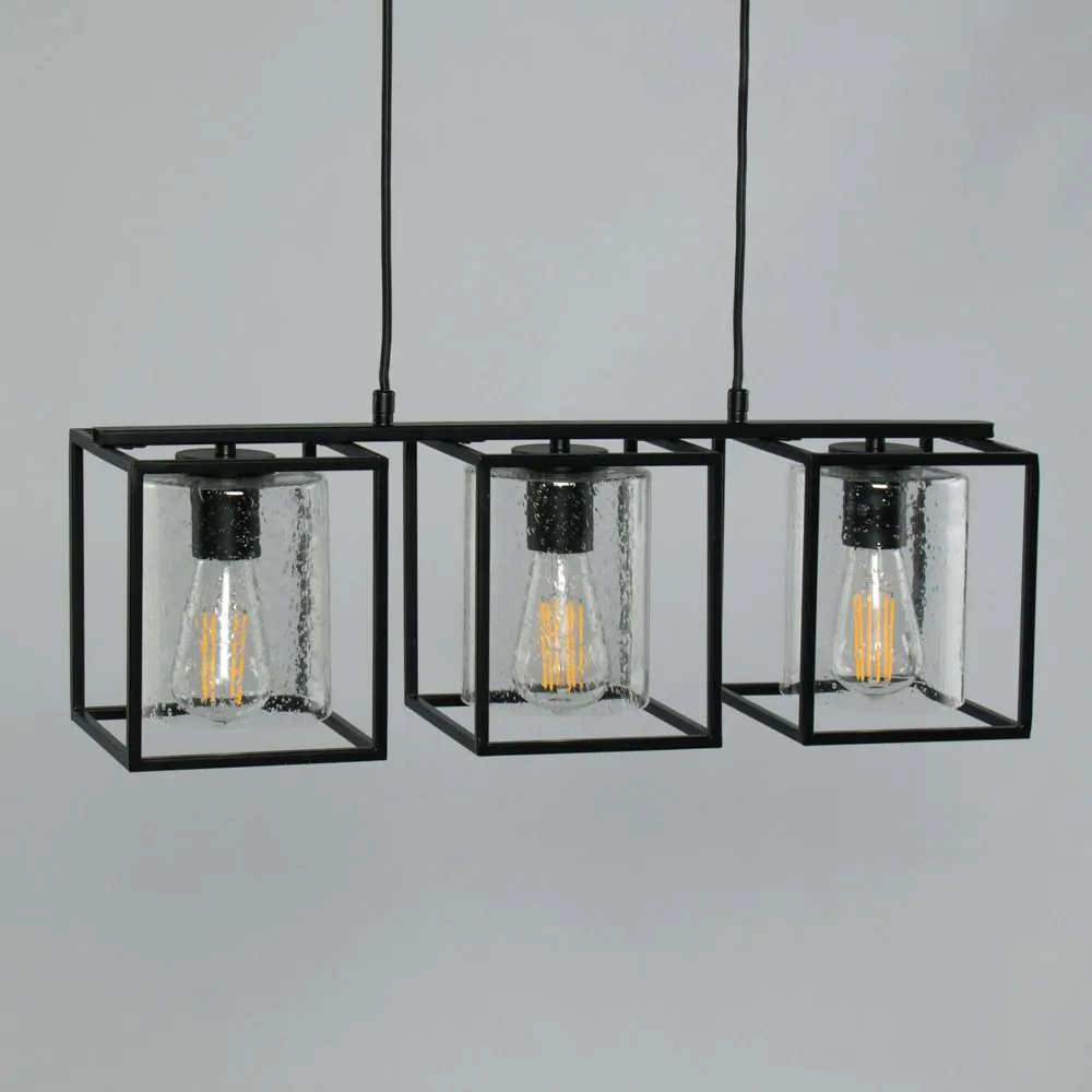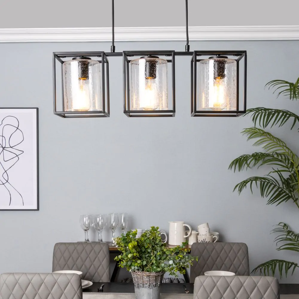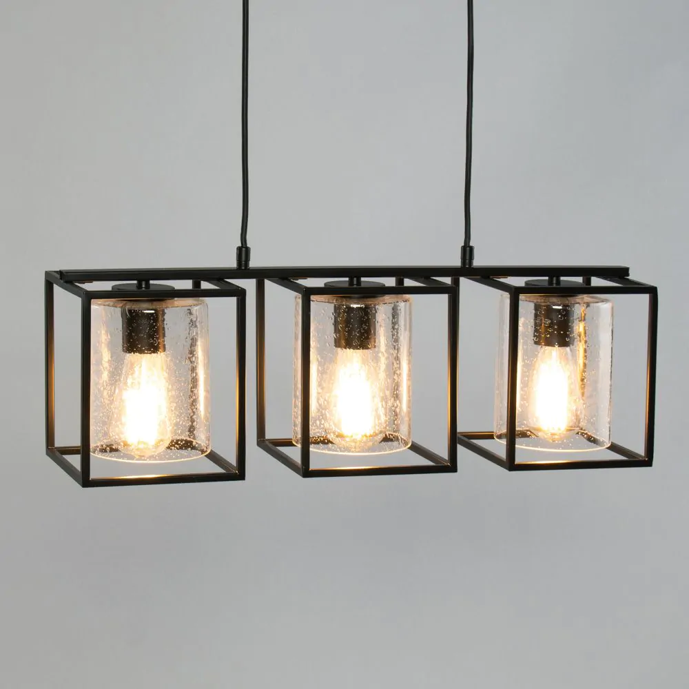 Inspire a modern look within your kitchen or dining room with the Hardy Cage Ceiling Pendant Bar with Bubble Glass Shades. Finished in matte black, this ceiling light features a box frame design for a minimalist aesthetic that suits scandi interiors perfectly. It also comes with gorgeous glass cylindrical shades that are perfect for displaying a vintage filament lightbulb within, looking ideal when styled over a kitchen island or dining table.
