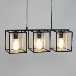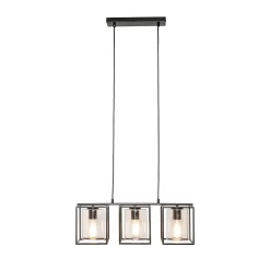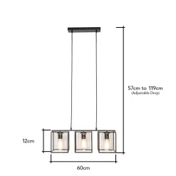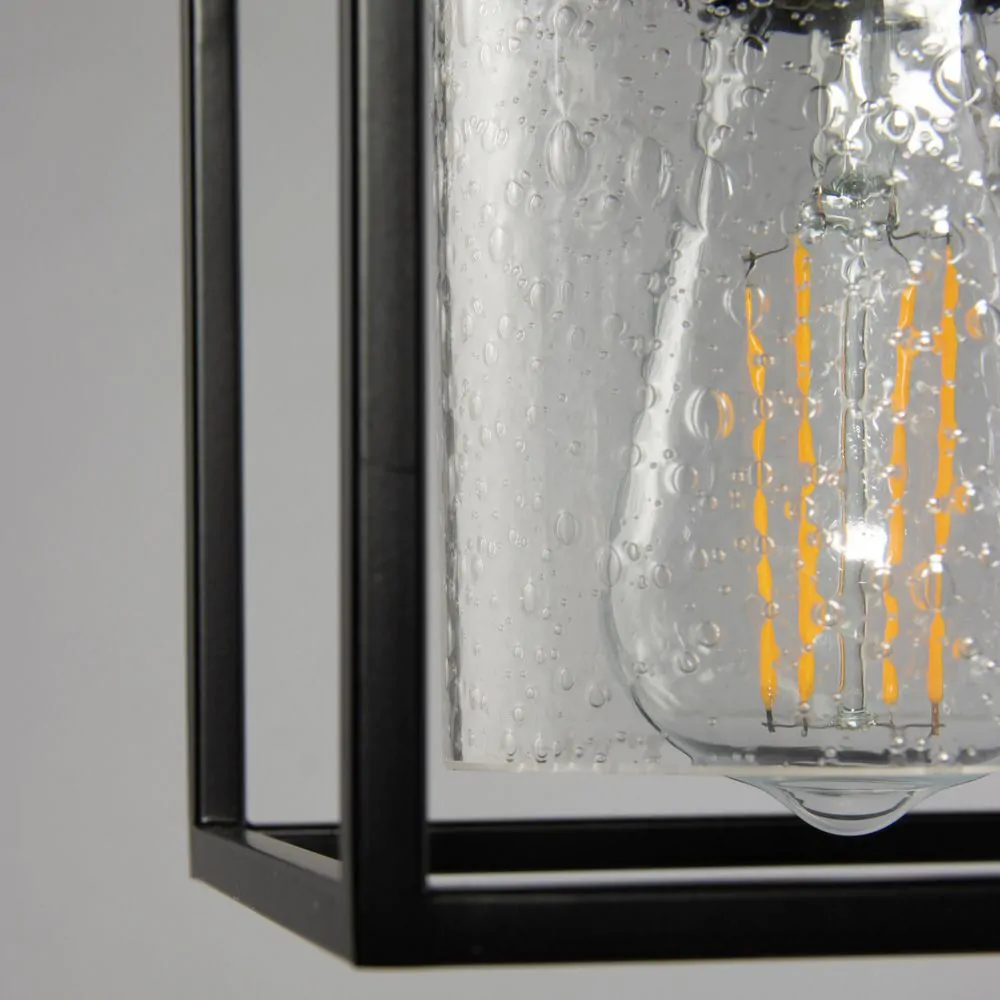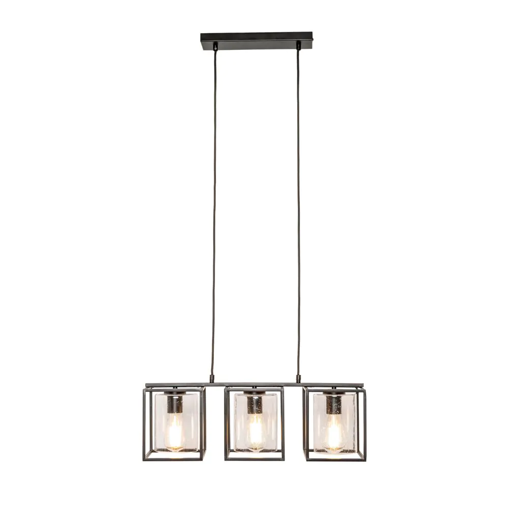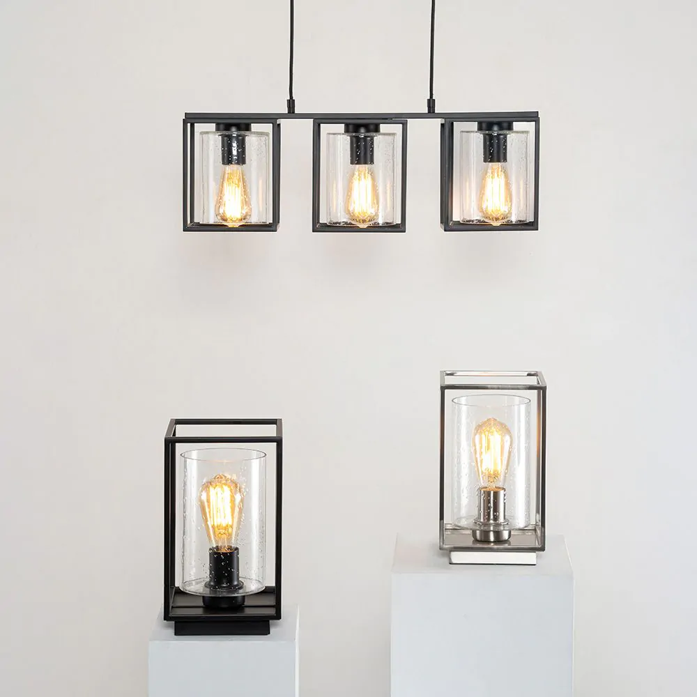 Inspire a modern look within your kitchen or dining room with the Hardy Cage Ceiling Pendant Bar with Bubble Glass Shades. Finished in matte black, this ceiling light features a box frame design for a minimalist aesthetic that suits scandi interiors perfectly. It also comes with gorgeous glass cylindrical shades that are perfect for displaying a vintage filament lightbulb within, looking ideal when styled over a kitchen island or dining table.