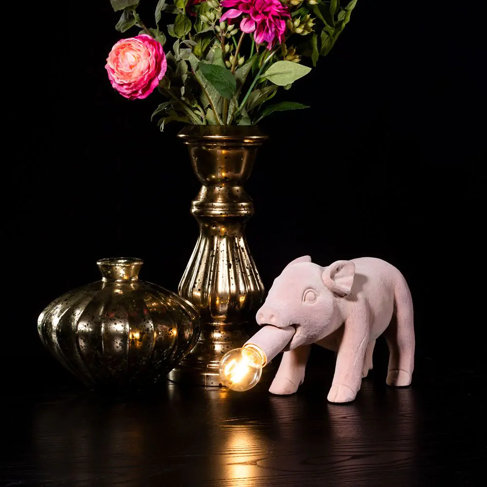 Meet Hilda Pig; a quirky table lamp that will certainly bring a fun flair. The clear Vintage E14 golf ball bulb carefully held in Hilda’s mouth casts a beautiful, bright light throughout your home. This flocked pink light has a unique texture and appearance that makes for a fun statement table lamp. With its vivid colours and charming exterior Hilda will add a unique touch to your home decor.