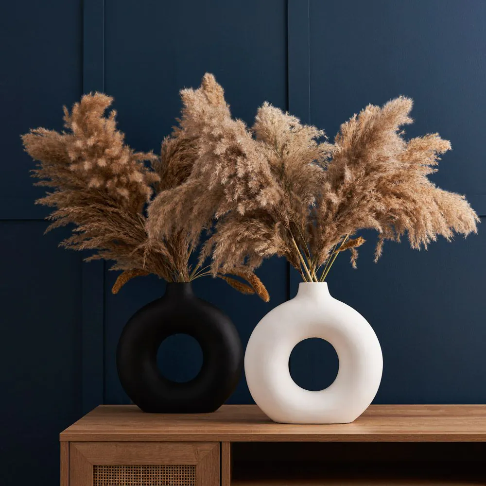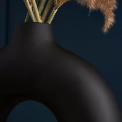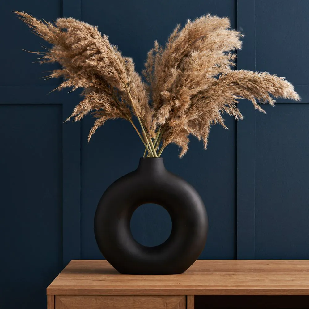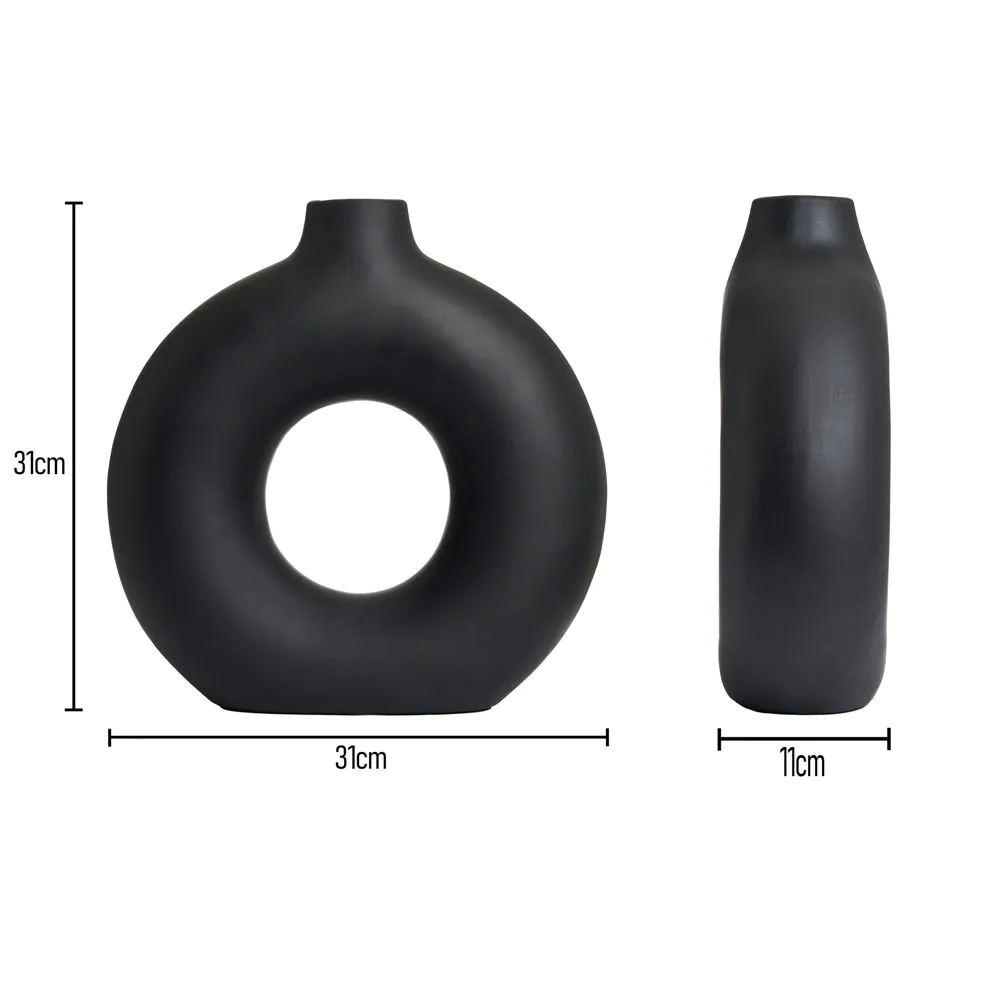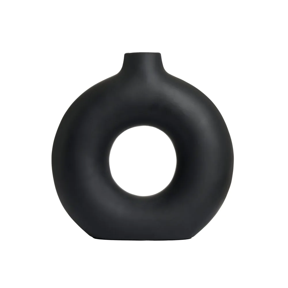 Enhance your decor with our Holey Ceramic Vase in Black, a sleek and contemporary piece that combines modern design with artistic flair. The hollow circle design creates a sculptural appearance that is ideal for monochrome or scandi interiors, making it a standout focal point. Its medium size allows for versatile styling options, whether you choose to showcase it as a standalone decorative object or to pair it with pampas grass or decorative branches.
