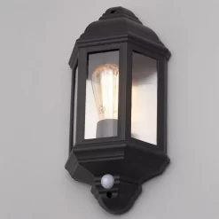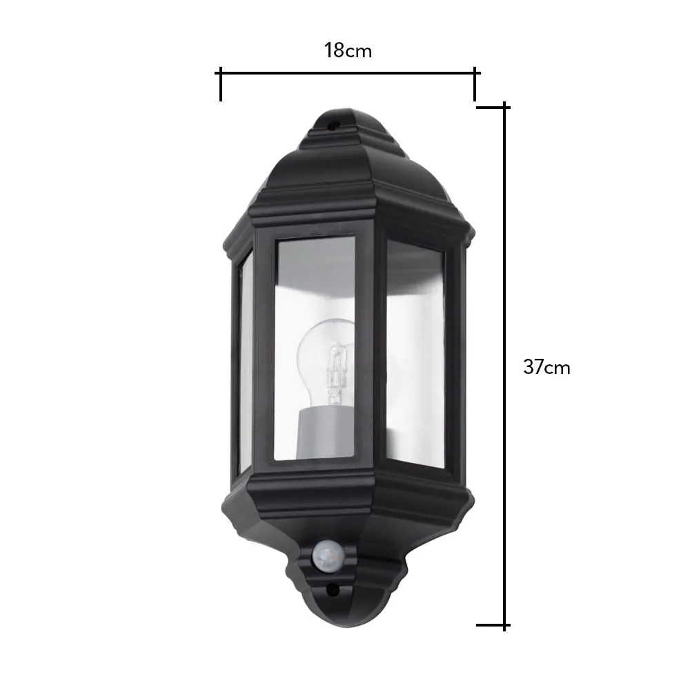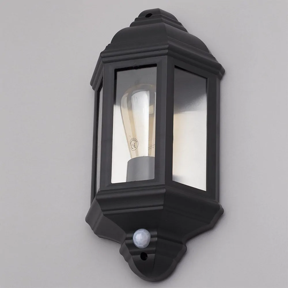 Reliable yet stylish outdoor lighting for your home, the Hunda 1 Light Outdoor Half Wall Lantern creates an urban aesthetic in your porch or entryway. This wall light features a classic lantern design and has a sleek black finish for a modern look. It also includes an in built PIR sensor which instantly triggers the light as soon as movement is detected outside your home, making for a great security feature outside your home.