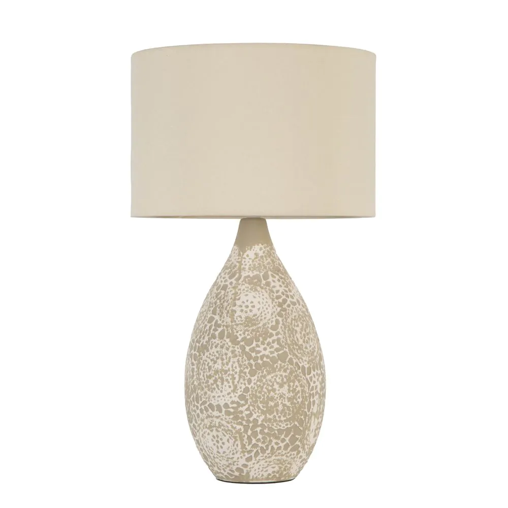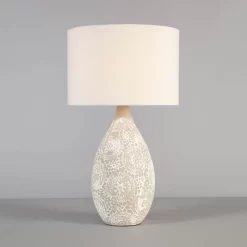 Bring a rustic feel to your home décor with the Inar Ceramic Table Lamp. This table lamp features a painted white doily-inspired etched design for a handcrafted aesthetic that looks ideal in neutral colour schemes. It also comes in a natural finish with a vase shaped based and a natural linen lampshade which diffuses a gorgeous warm glow into the room, ideal for styling on bedside tables in boho interior design.