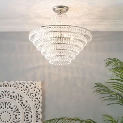 This gorgeous 5 light flush ceiling fitting finds the perfect balance between practicality and style, working well on low ceilings without having to sacrifice its stylish design! The 6 tier chrome structure has an elegant, modern look that’s great for the dining room, bedroom, or living room, giving a fresh and updated style to any décor! The crystal effect glass droplets catch the light for a sophisticated shimmer, making the Ivy flush light a wonderful addition to your home.