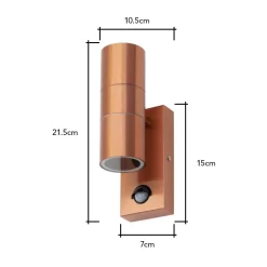 Trendy industrial styled lighting for the outside of your home, the Jared Outdoor Wall Light gorgeously illuminates your outdoor spaces with an up and down design. This light features a stylish copper finish which looks stunning in any porch or entryway. It also features a PIR sensor to detect movement outside your home, instantly triggering the light to turn on which is ideal to deter any unwanted intruders from your property.