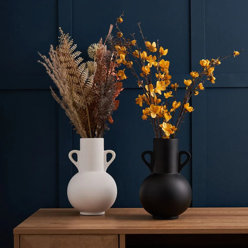 Enhance your interior with our Jug Ceramic Vase in Black, a sleek and contemporary piece that adds a touch of modern sophistication. The jug-shaped silhouette offers a stylish twist, while the black colour exudes elegance and versatility. Its compact size makes it perfect for displaying single stems or dried floral arrangements, creating an eye-catching focal point.