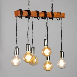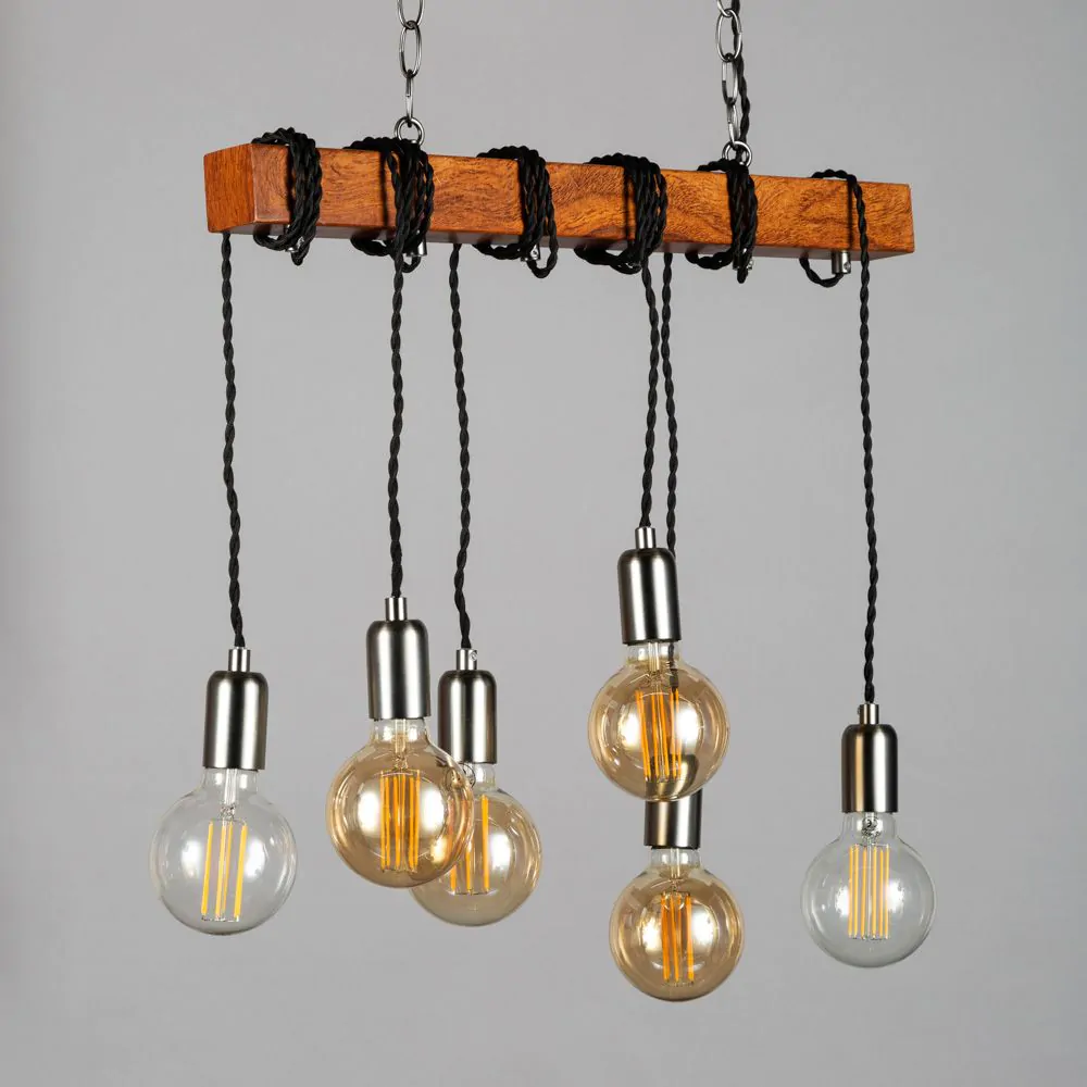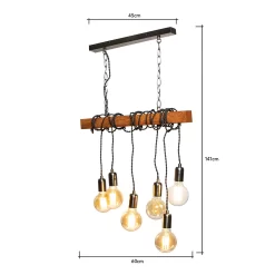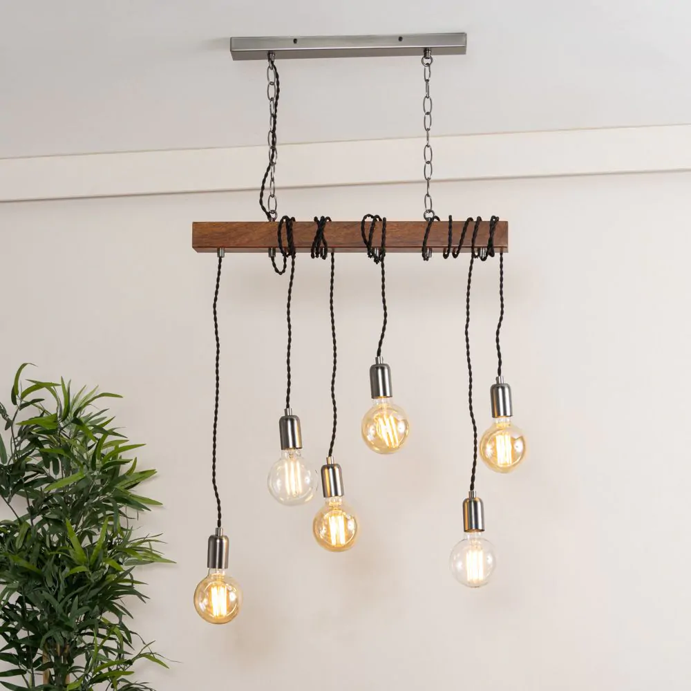 The Kya Wooden Bar Ceiling Pendant brings industrial with a twist into any home. The combination of the steel chains & natural wood, paired with drop pendants and exposed bulbs brings a unique yet stylish touch to any home, that is sure to make an impression. The 6 exposed bulbs provide you with unfiltered practical lighting through out your space, ensuring maximum visibility within your home. Perfect for styling over dining tables, kitchen islands or breakfast bars, where additional lighting is required.