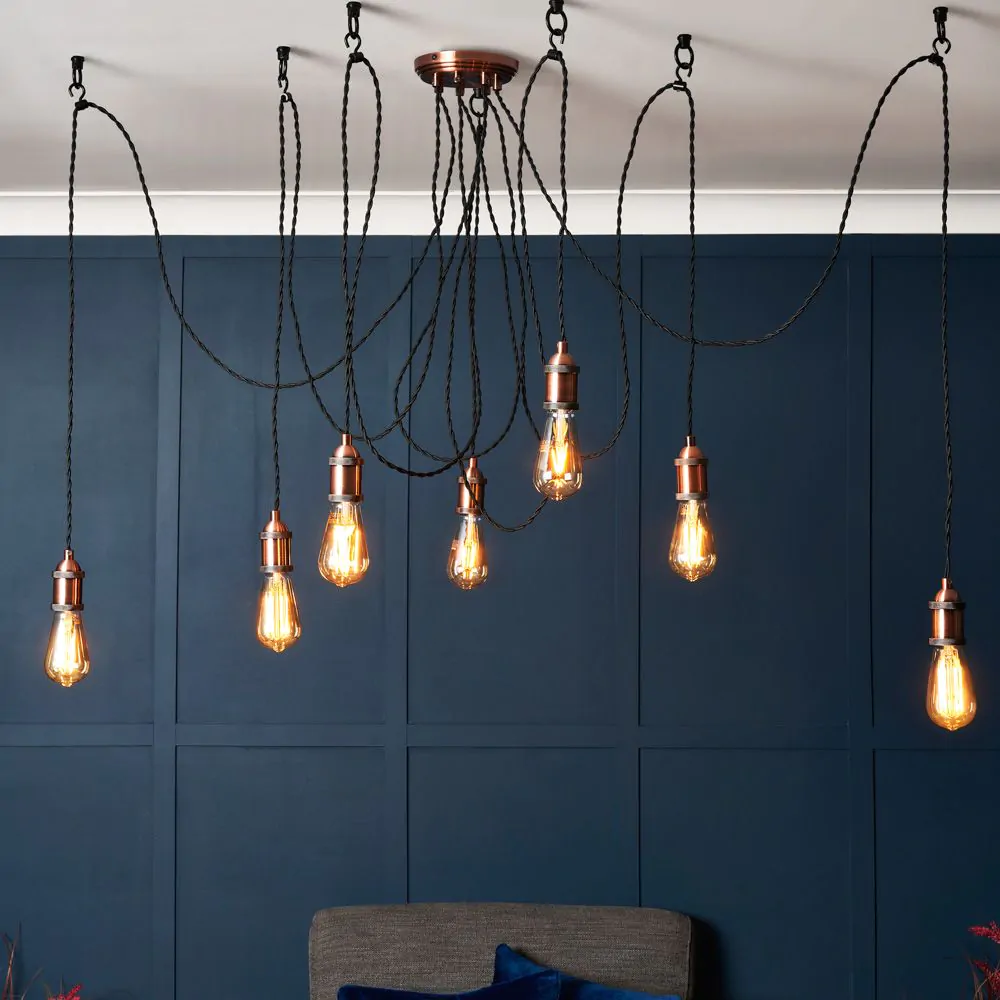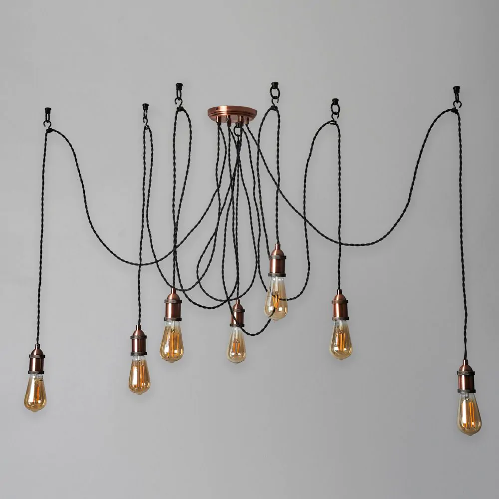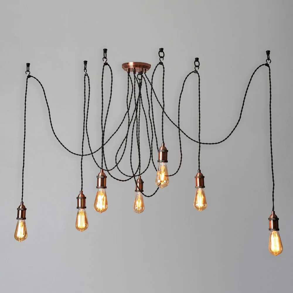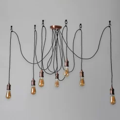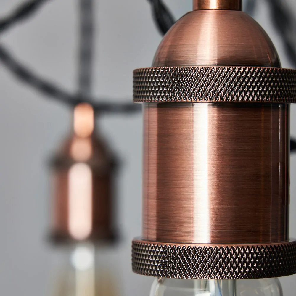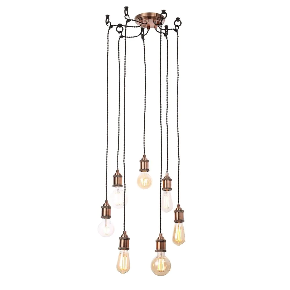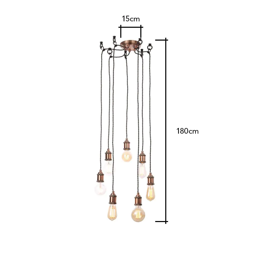 Bring bold industrial style into your home with this spectacular 7 light cluster pendant fitting! The robust design is perfect for making a statement in any décor, with an antique copper finish offering a trendy urban vibe. A central copper ceiling plate is surrounded with additional rings for the braided cables to hang from, giving a wider spread to the light with each of the mechanical style bulb holders hanging at staggered heights. Ideal for use with vintage bulbs, this industrial piece is the perfect focal point for a quirky urban décor!