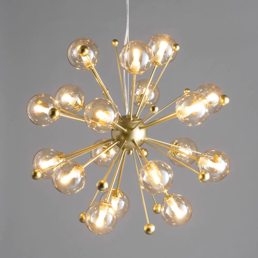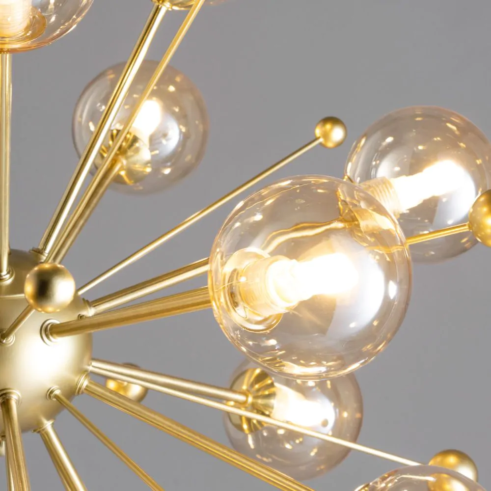 - Champagne toned glass shades diffuse a warm glow throughout the room;
