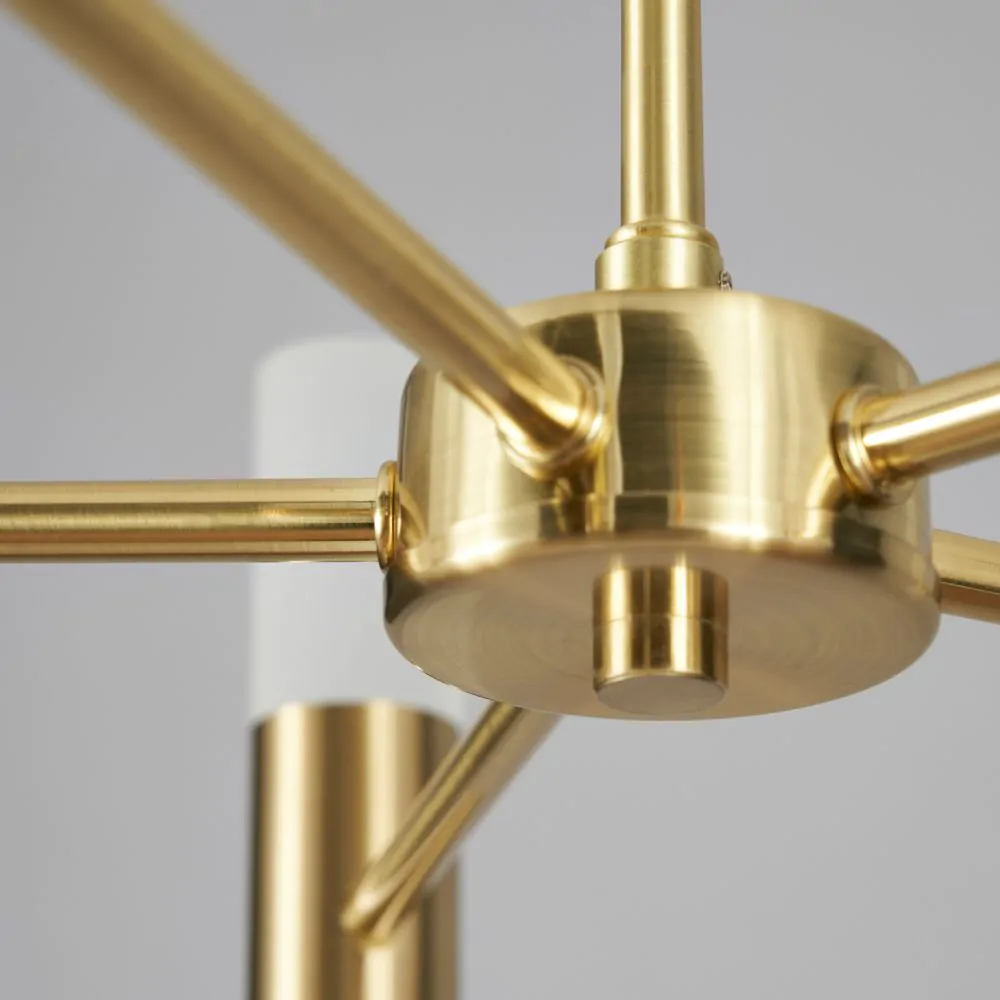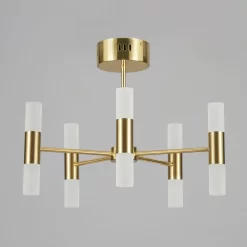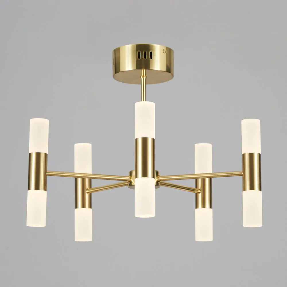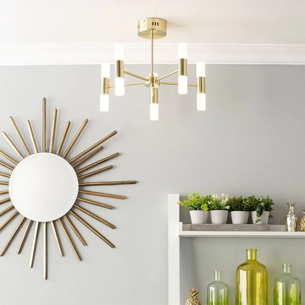Our Lois semi-flush ceiling light is a minimalistic piece that looks perfect in any décor, with the sleek cylinder design fitting into any modern interior with ease, whilst the satin brass finish and frosted shades could also look great in a retro, 70’s inspired space. The 10 light fitting features 5 up and down cylinder lights, which give a fantastic spread of light across the room. A semi-flush structure makes this light great for lower ceilings, but does not limit them to those spaces either, making this a versatile piece for any interior. Lois is an integrated LED fitting, which means durable, energy efficient light is given to your home to create a cost-effective lighting theme for your home.