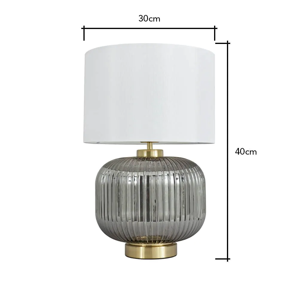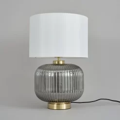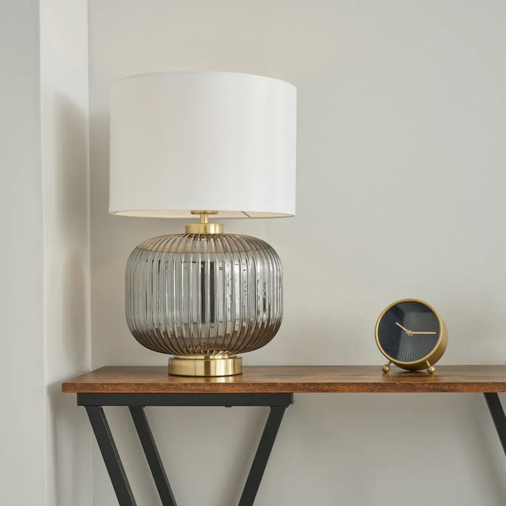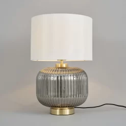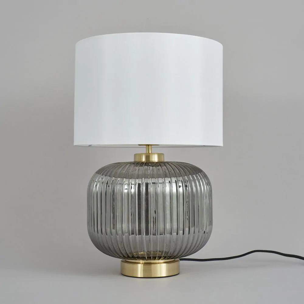 Lyna Table Lamp with Smoked Glass Base and White Shade, Satin Brass