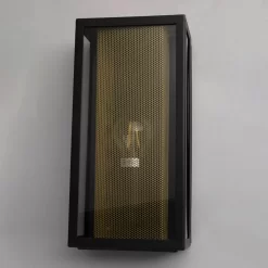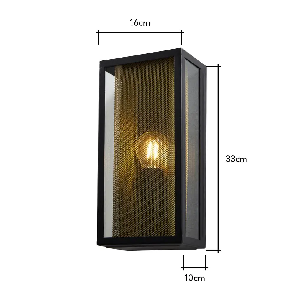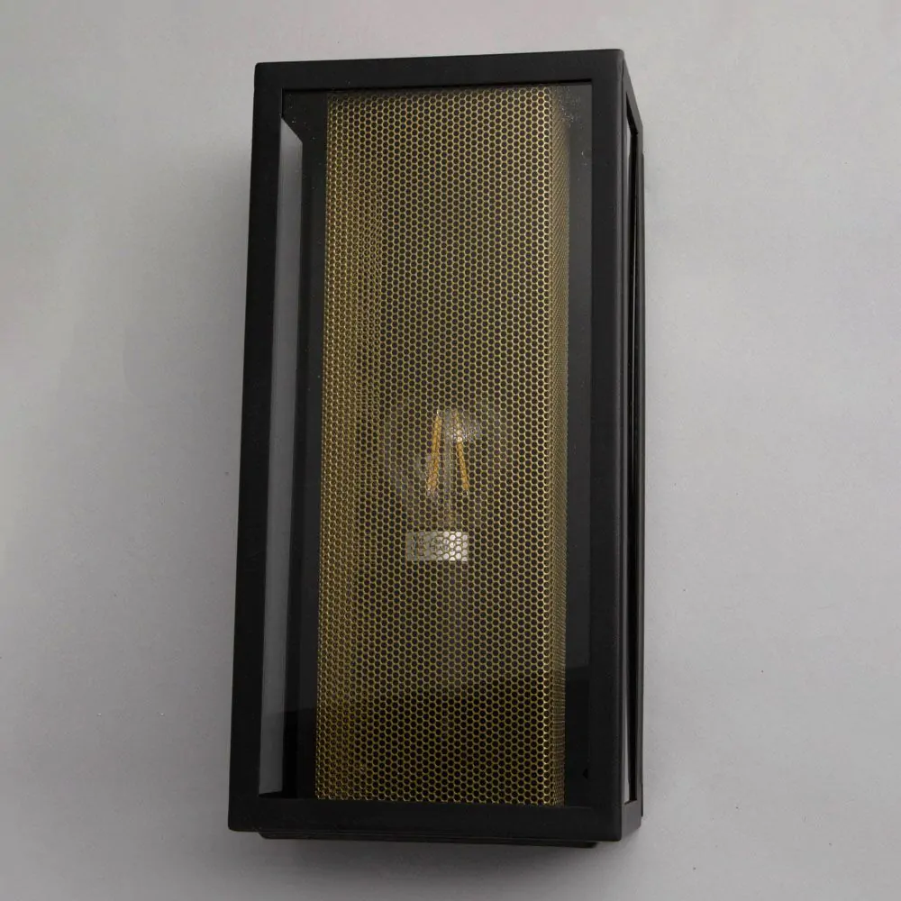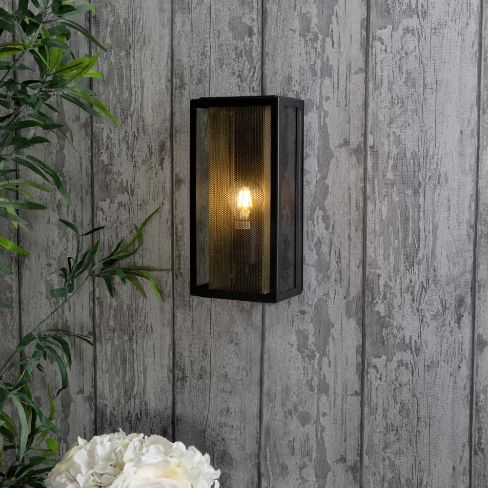 Bring a stylish look to the outside of your home with the Marco Outdoor Box Light with Brass Mesh. This wall light comes in a sleek black finish with a stunning mesh brass insert for a decorative aesthetic. It is also IP44 rated for water resistance against outdoor weather conditions and looks ideal when styled on either side of a doorway or entryway.