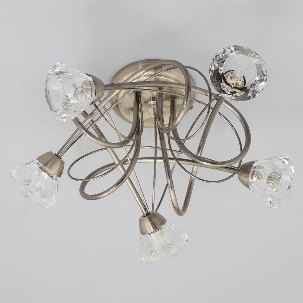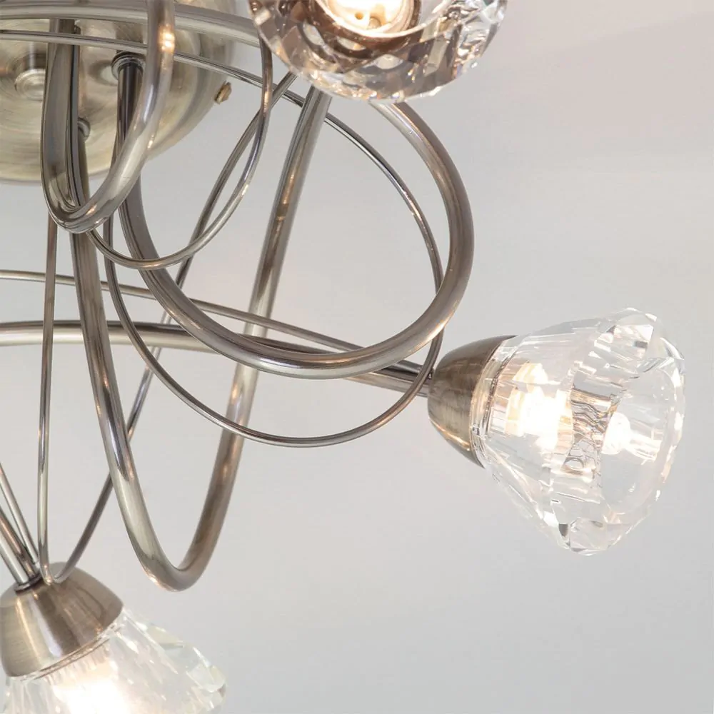 The Marianne 5 light flush ceiling fitting is great for those rooms with lower ceilings, as it requires less drop space. The 5 lights are perfectly placed on an arrangement of curving arms which loop in and out of each other to form a knotted look, with cut glass shades giving a softer twist to the lighting. An antique brass colour gives a classic finish to this 5 light flush.